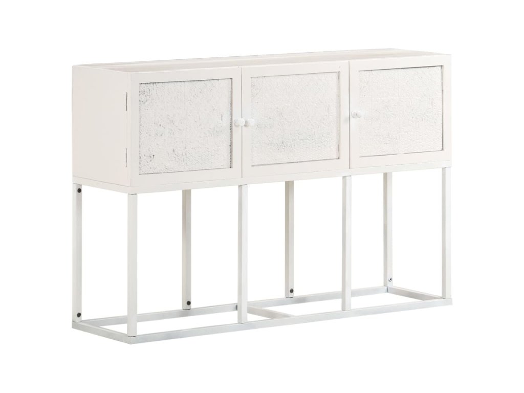 Odkládací skříňka je vyrobená z masivního mangovníku. Toto tropické tvrdé dřevo dokáže unést značnou váhu a skvěle odolává zubu času, takže je velice stabilní a dlouho vám vydrží. Práškově lakovaný železný rám přispívá ke stabilitě skříňky. Ve skříňce jsou přihrádky se 3 dvířky, za kterými najdete spoustu úložného prostoru. Pevná horní deska je perfektní k vystavení nejrůznějších dekorací, jako jsou zarámované fotografie, pokojové rostliny, vázy apod.