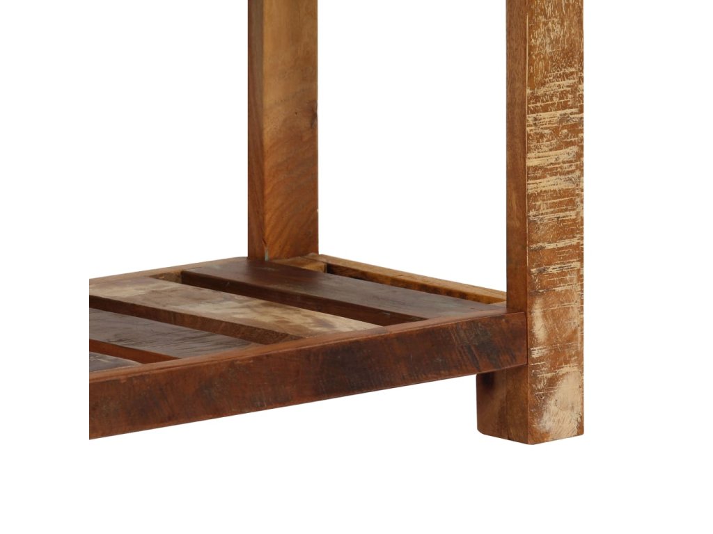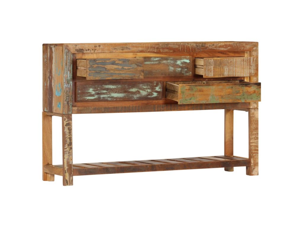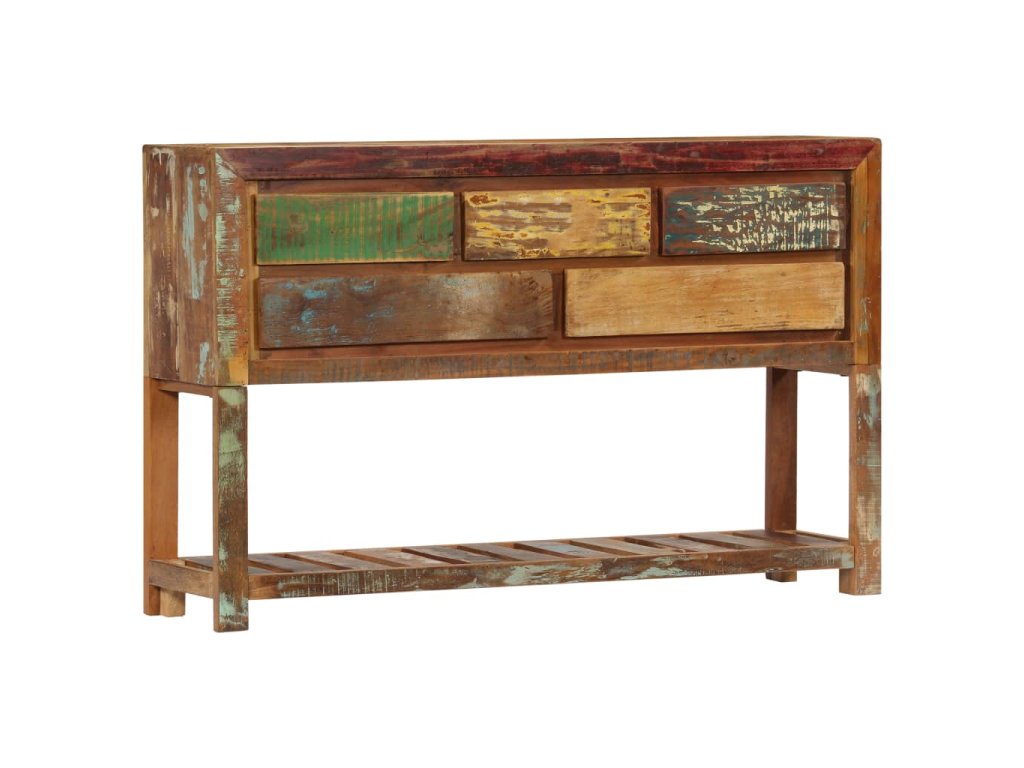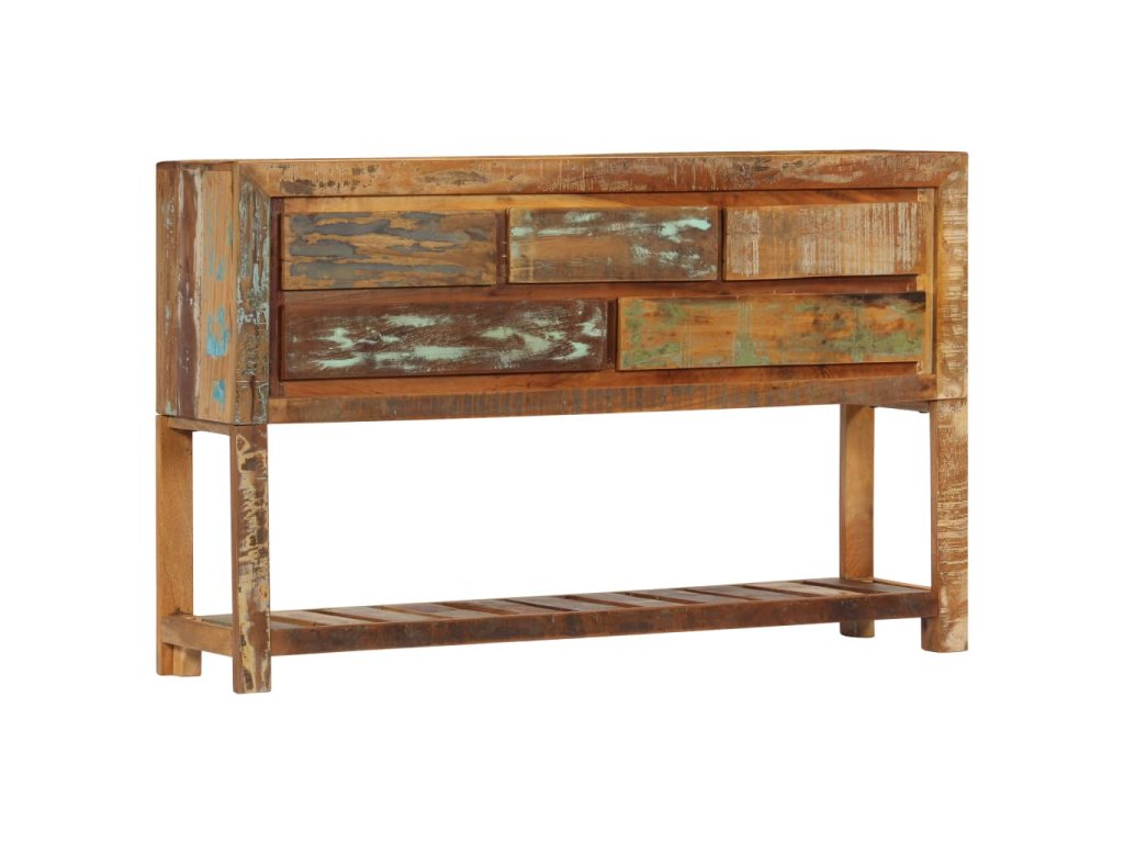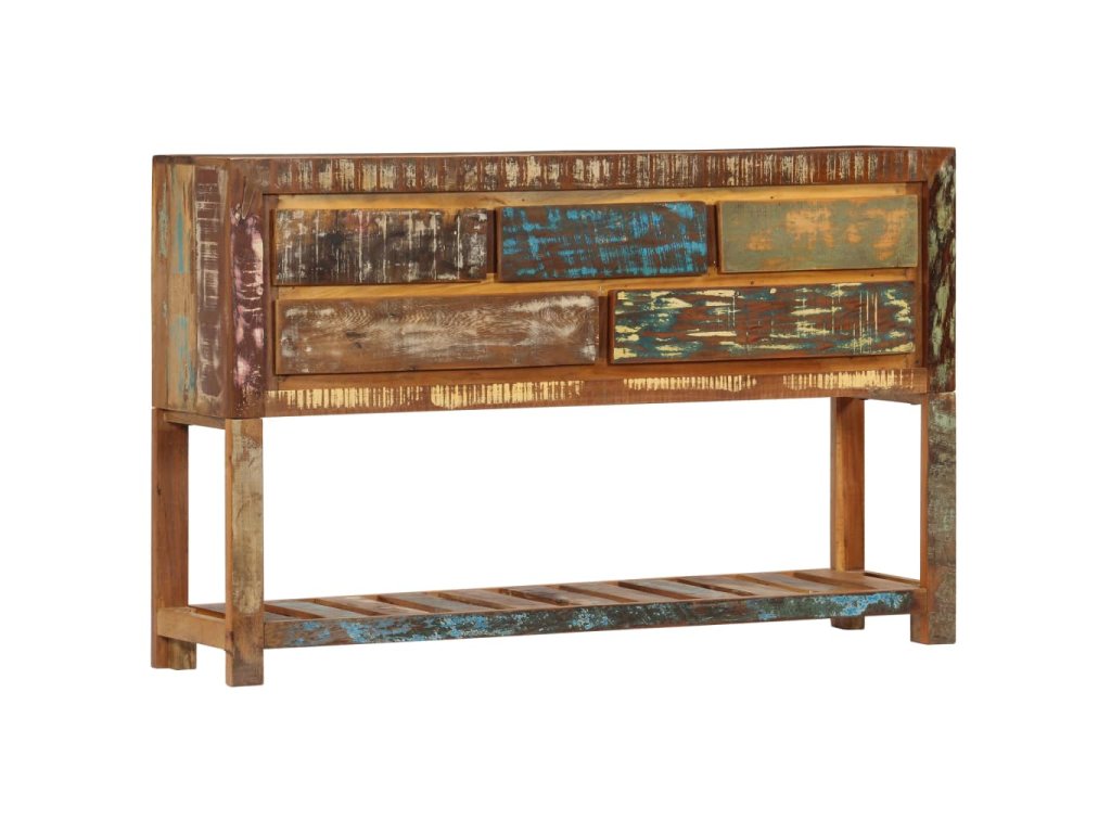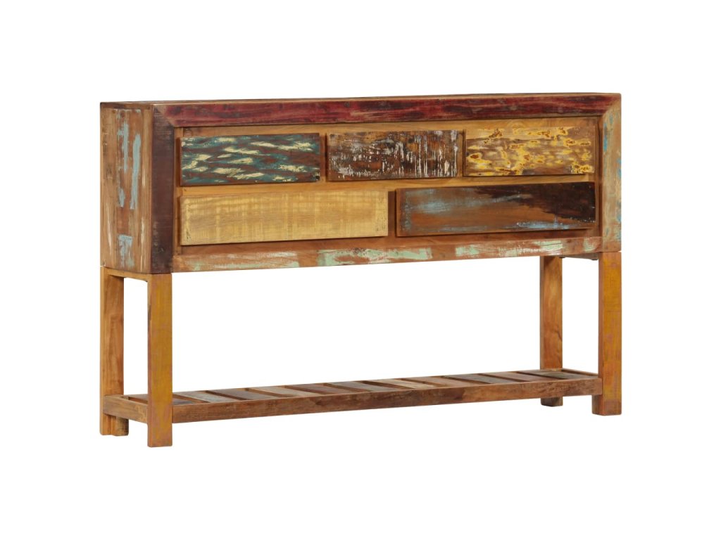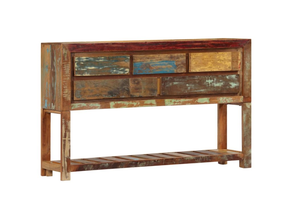 Tento konzolový stolek je vyrobený z masivního recyklovaného dřeva, které pochází z trámů, podlah a podpěrných nosníků ze starých budov určených k demolici. Sestává tedy z celé řady různých druhů dřeva, jako jsou borovice, teak, buk, dub, cedr, mangovník, akácie atd. Recyklované dřevo tak nabývá vlastností všech těchto rozličných typů dřevin. Navíc je již zestárlé, ošlehané a vyschlé, takže se nesmršťuje ani neohýbá. Řemeslné zpracování prvotřídní kvality a elegantní kresba dřeva činí každý kus nábytku zcela jedinečným a lehce odlišným od všech ostatních. Příborník disponuje 5 zásuvkami a 1 policí, které vám poskytnou spoustu úložného prostoru na oblečení, knížky a nejrůznější další věci.