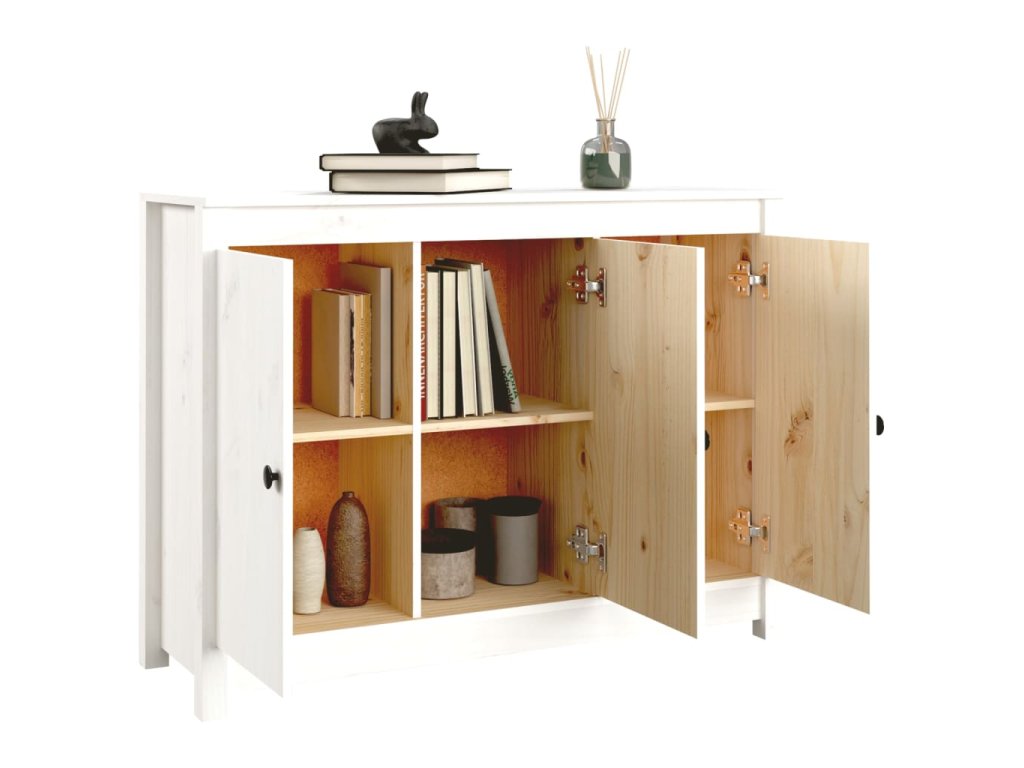 - Masivní borové dřevo: Masivní borové dřevo je krásný přírodní materiál. Borové dřevo má rovnou kresbu a obsahuje suky, které materiálu dodávají jeho charakteristický, rustikální vzhled. Příborník je pro lepší stabilitu vyrobený z masivního dřeva.