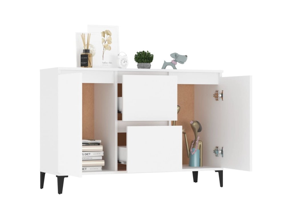 Tato odkládací skříňka je robustní a odolná a bude vám sloužit po dlouhá léta. Kovové nohy zvyšují její stabilitu. Je vybavená 2 zásuvkami a 2 dvířky a poskytuje dostatek úložného prostoru pro vaše předměty. Na robustní horní desku si můžete vystavit dekorativní předměty a fotorámečky. Úložnou skříňku lze navíc snadno čistit vlhkým hadříkem.
