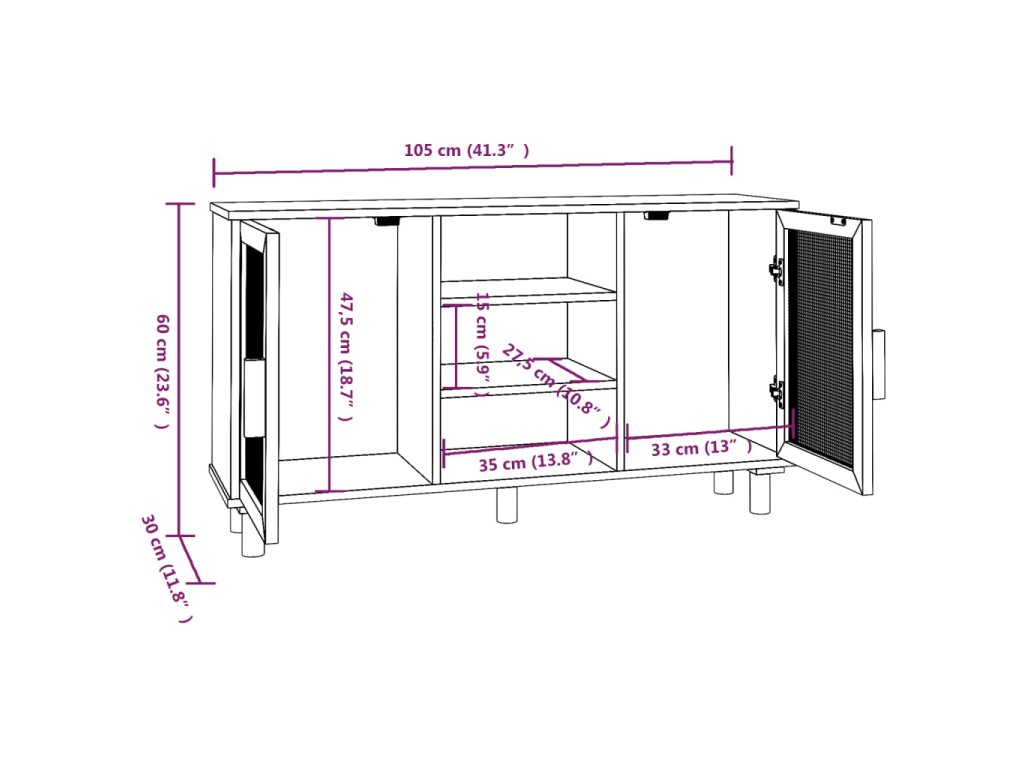 Příborník bílý 105x30x60 cm masivní borovice a přírodní ratan