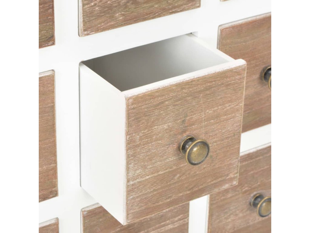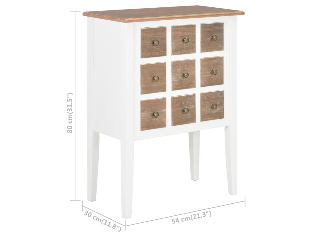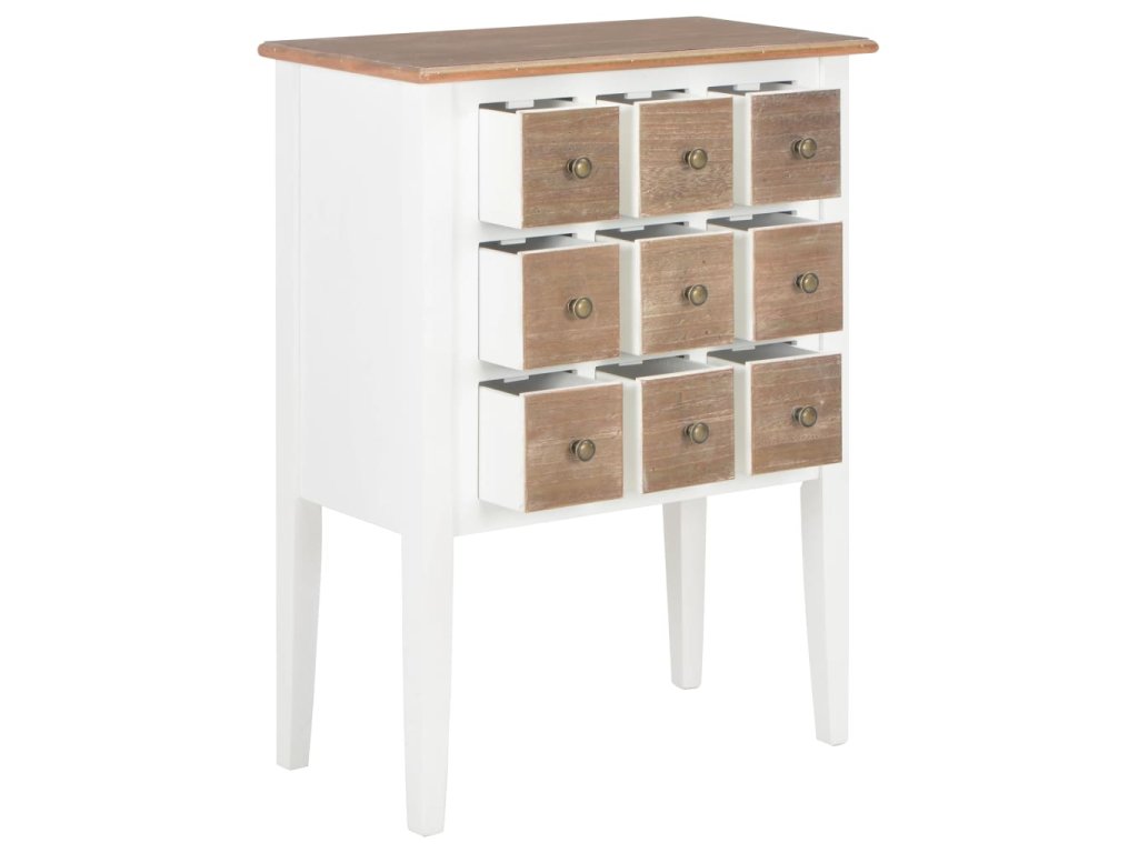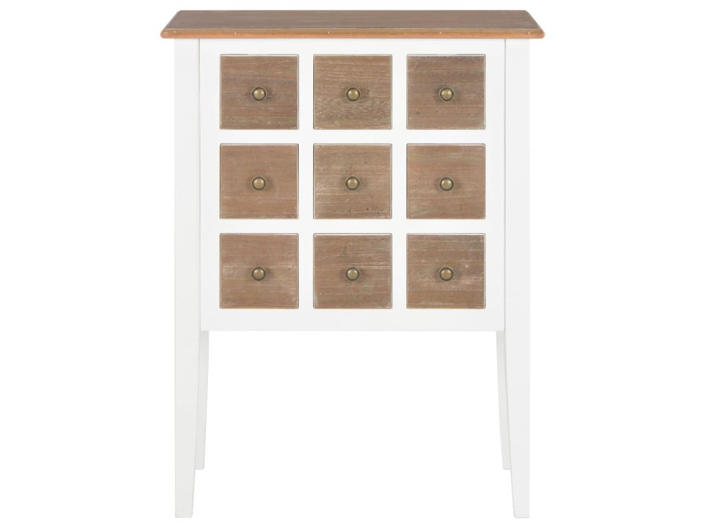 Tato odkládací skříňka ve venkovském stylu je zhotovena z masivního dřeva, které bylo opatřeno nátěrem, což skříňce dodává rafinovaný vzhled a k jejímu čištění vám postačí pouze navlhčený hadřík. Dřevěná skříňka má devět zásuvek, takže vám poskytne spoustu úložného prostoru. Klasické knopky podtrhují půvabný vintage styl této úložné skříňky. Produkt se snadno sestavuje.