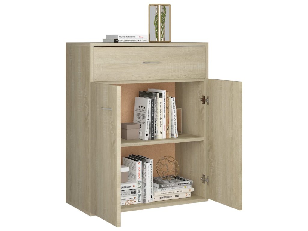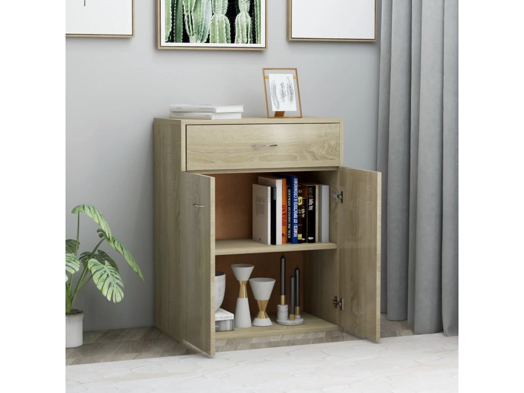 V příborníku je skříňka s dvojími dvířky a jedna zásuvka, najdete zde tudíž spoustu úložného prostoru pro vaše knihy, multimediální zařízení a další předměty. Robustní svrchní deska je ideálním místem pro vystavení dekorativních předmětů, zarámovaných fotografií nebo pokojových rostlin. Příborník lze také využít jako odkládací skříňku, komodu apod. Je zhotovený z kompozitního dřeva prémiové kvality a vydrží vám sloužit dlouhé roky.