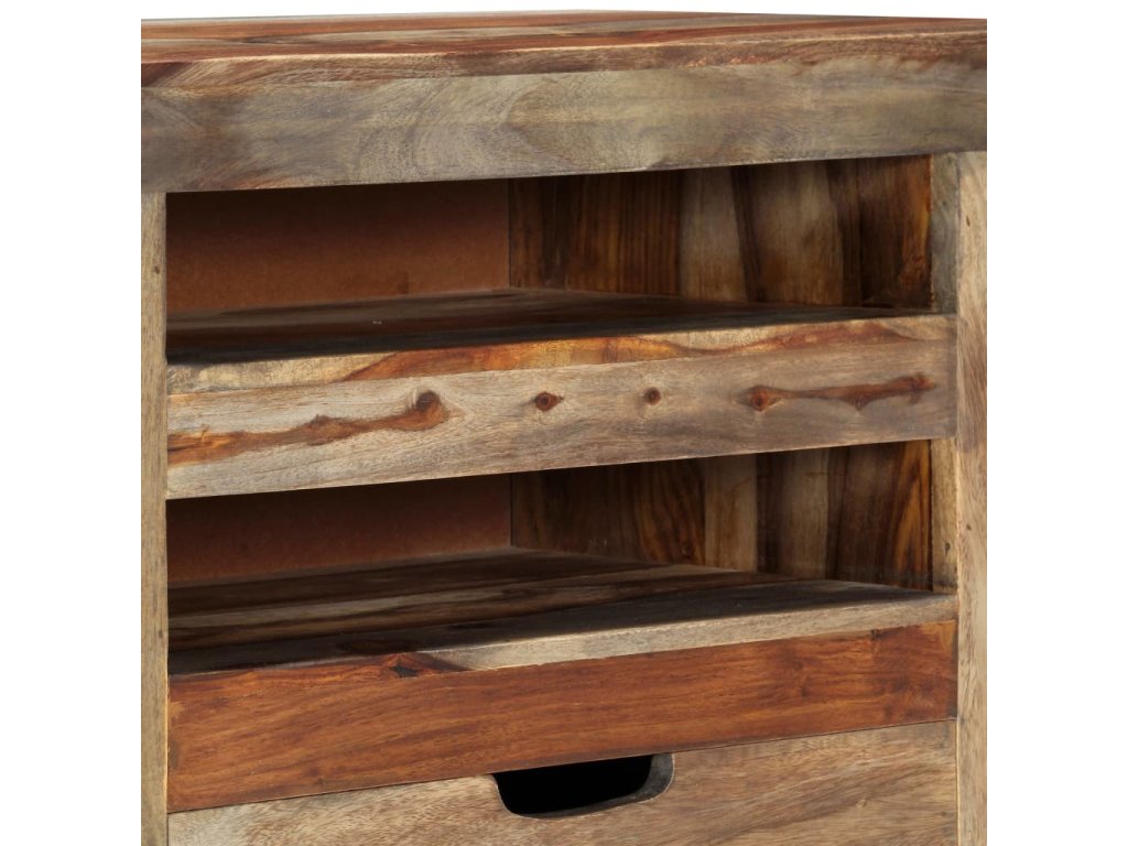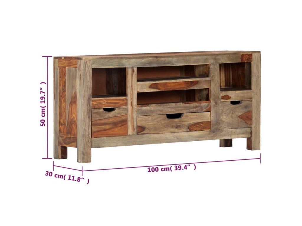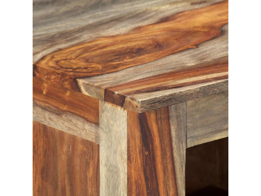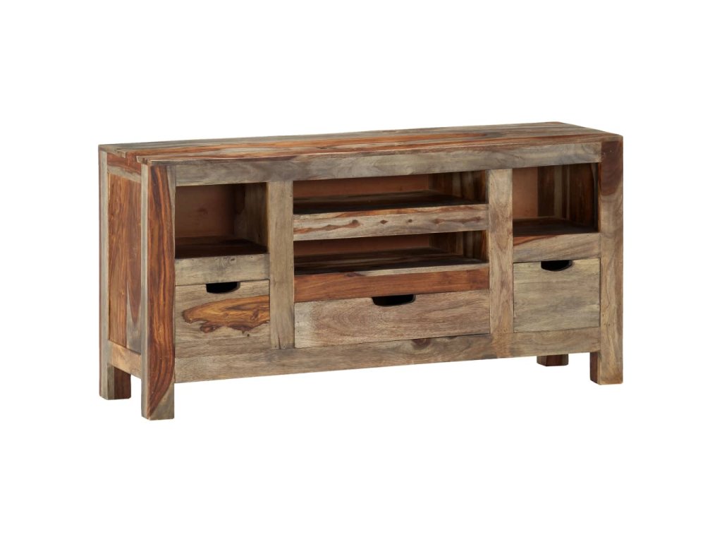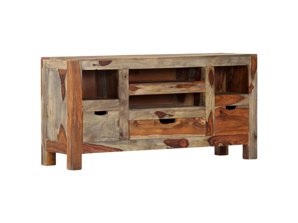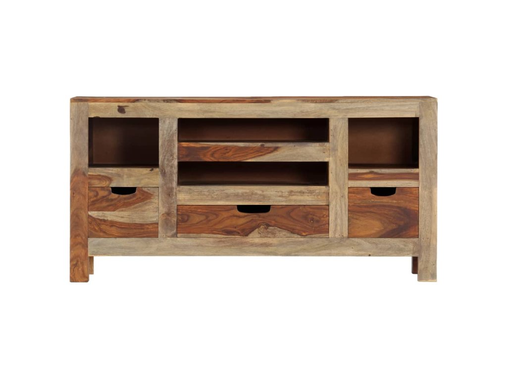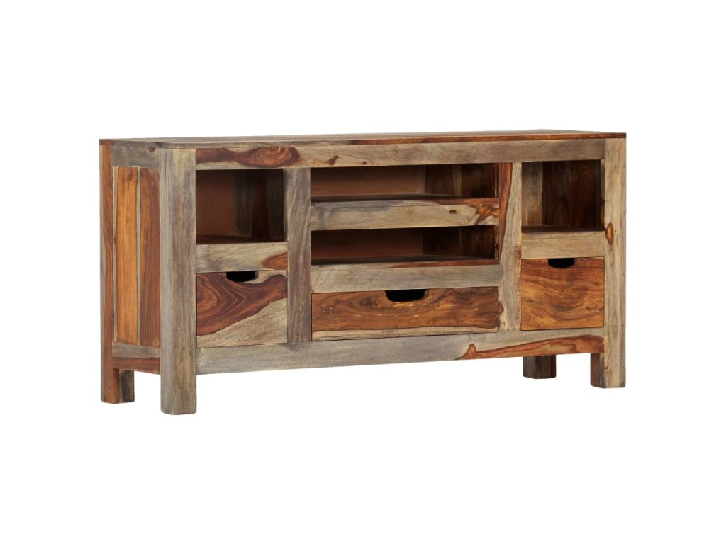 Skříňka je zhotovená z masivního akáciového dřeva, tropického tvrdého dřeva, které je známé také jako rosewood nebo palisandr a je proslulé svou přírodní kresbou a hladkou texturou. Navíc se neohýbá ani nepraská a je přirozeně odolné vůči trouchnivění. V důsledku toho je tento krásně navržený TV stolek mimořádně stabilní, odolný a okamžitě upoutá pozornost. Zručné řemeslné zpracování zaručuje, že se každá fáze výrobního procesu provádí s největší péčí, ať už se jedná o leštění nebo lakování. Naše dřevěná skříňka je zcela ručně vyrobená a vzhledem k esteticky přitažlivé kresbě dřeva je každý kus nábytku jedinečný a lehce odlišný od ostatních. Tento příborník má 3 zásuvky a 4 otevřené přihrádky, nabízí tudíž dostatek místa pro ukládání vašich multimediálních zařízení, knih a celé řady dalších věcí.