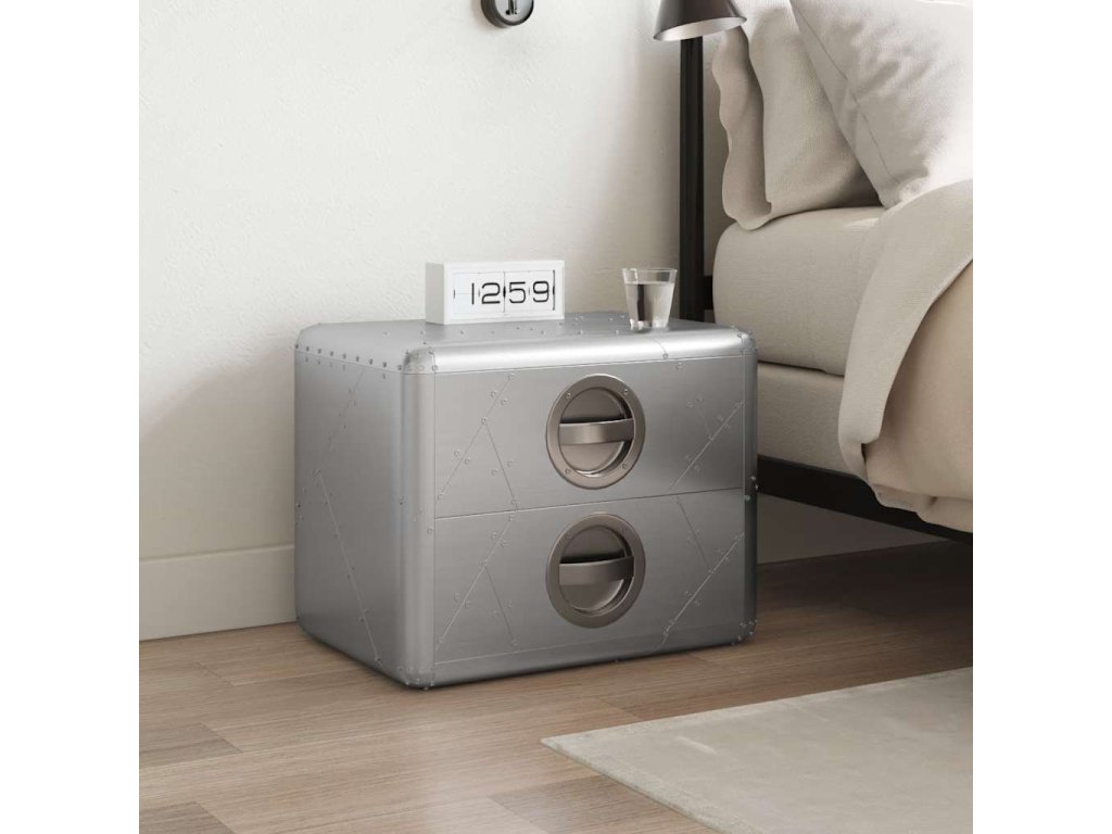 Tento odkládací stolek je vyroben z masivního dřeva a jeho povrch je pokrytý patchworkem z leštěných hliníkových plátů s odkrytými ocelovými šrouby, které umocňují jeho vzhled. Stolek je tedy mimořádně odolný. Hladké hrany a retro úchytky dodávají tomuto odkládacímu stolku jedinečný vzhled.