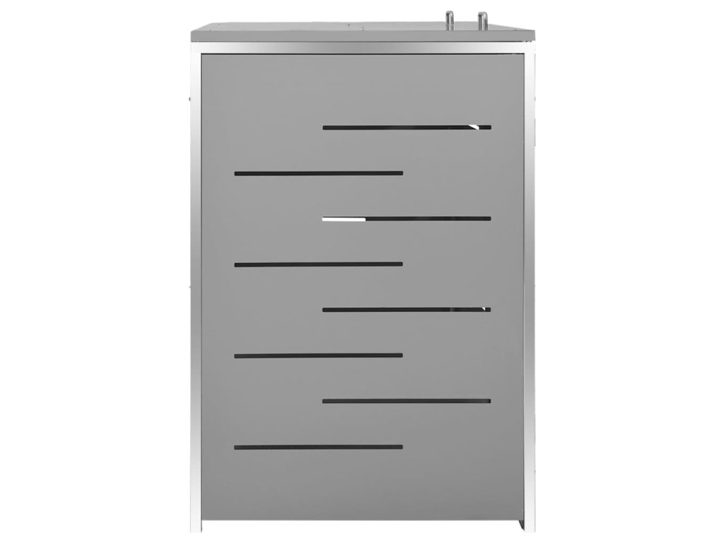 Tento přístřešek na popelnice je vyroben z pozinkovaného ocelového panelu a rámu z nerezové oceli, takže je mimořádně robustní a odolný proti korozi. Dutá konstrukce umožňuje cirkulaci vzduchu a zabraňuje, aby v popelnicích vznikal nepříjemný zápach. Uzamykací systém zároveň zajišťuje bezpečné uložení odpadků. Praktické víko a pružiny navíc usnadňují vkládání a vyjímání popelnic.