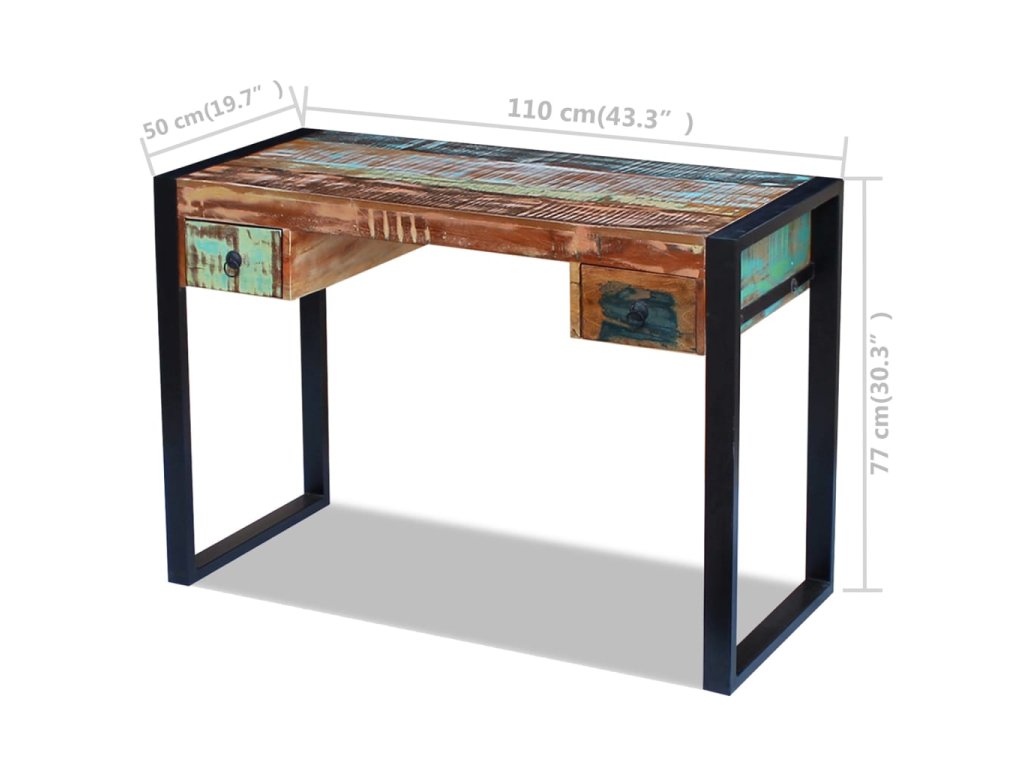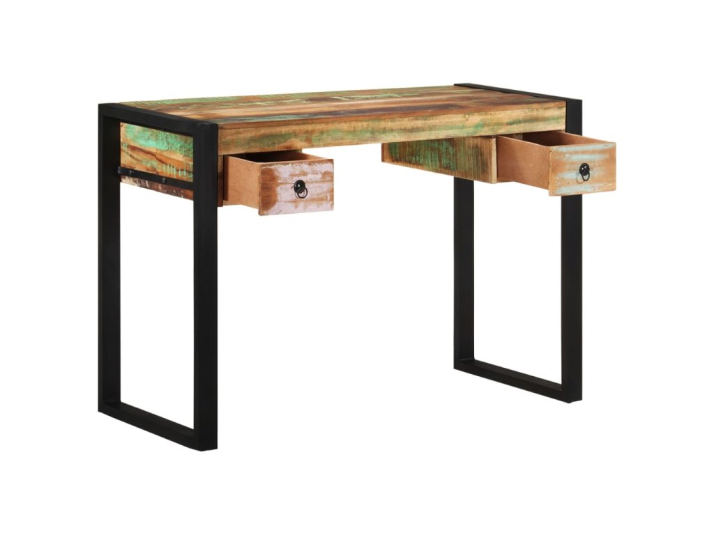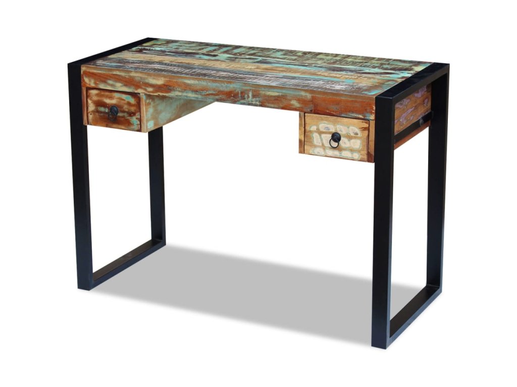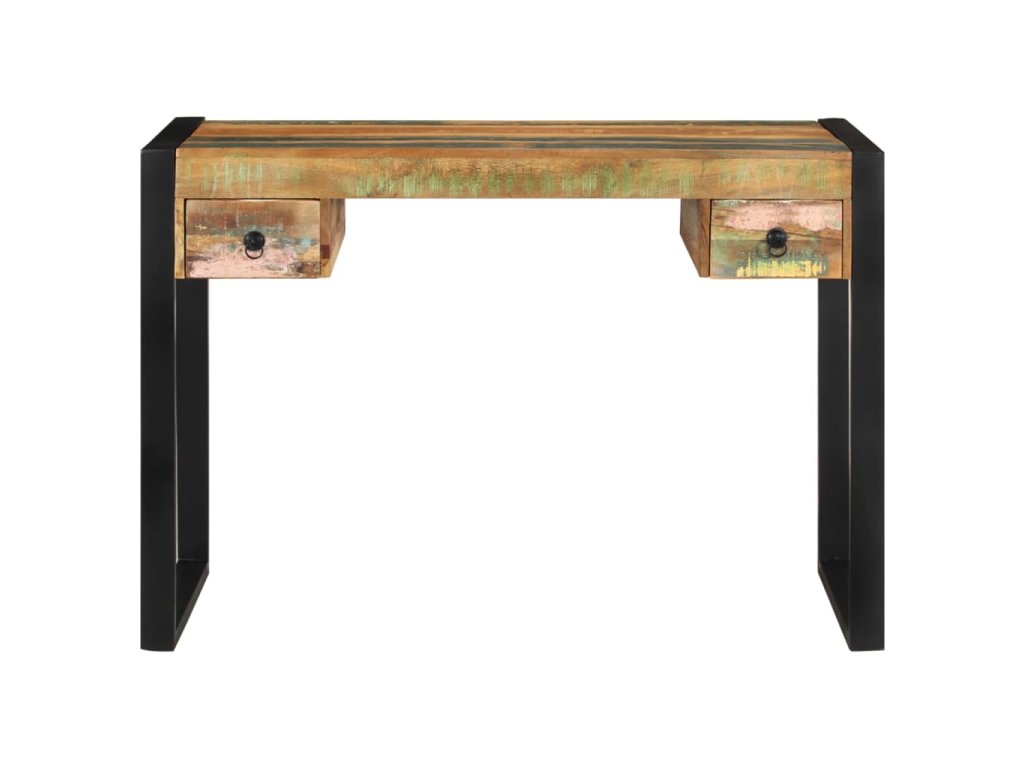 Tento dřevěný psací stůl ve vintage stylu, vyrobený z masivního recyklovaného dřeva, bude ve vaší domácnosti nadčasovým kusem nábytku. Díky svému pevnému ocelovému rámu je tento stůl velmi stabilní a odolný. Stolní deska poskytuje stabilní a bezpečnou plochu k odkládání nápojů, košíků s ovocem, váz či dalších dekorativních předmětů. Jeho dvě zásuvky vám poskytnou spoustu místa na ukládání drobností, jako jsou klíče, poznámkové bloky a další maličkosti. Stůl se dá používat jako PC stůl, pracovní stůl, kancelářský stůl, stůl na čtení a studium apod. Můžete ho používat také jako odkládací nebo konzolový stolek.