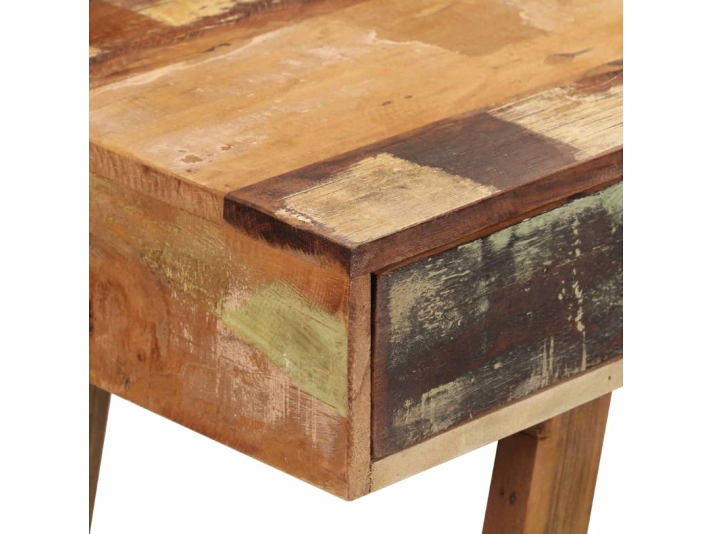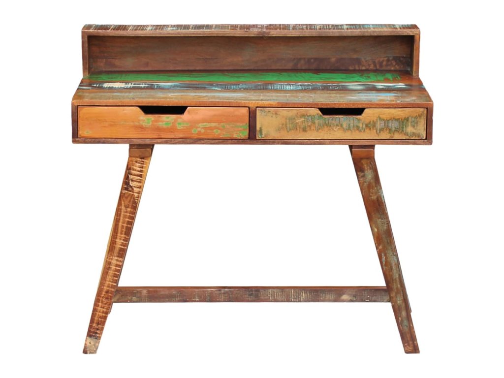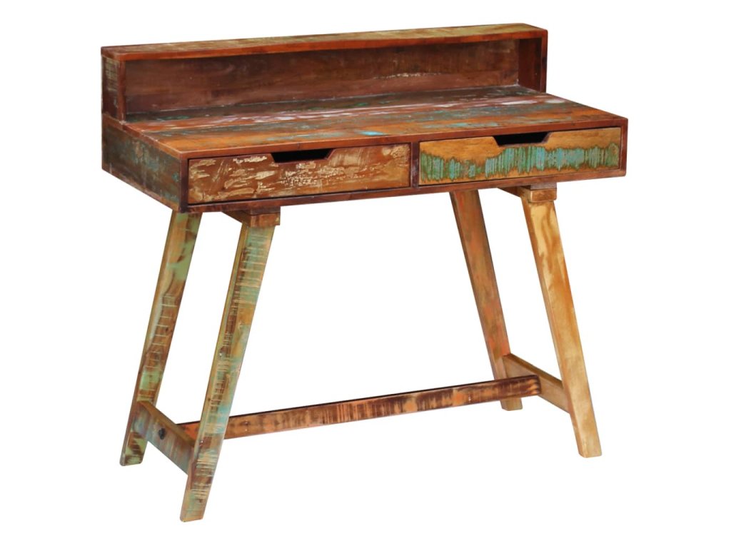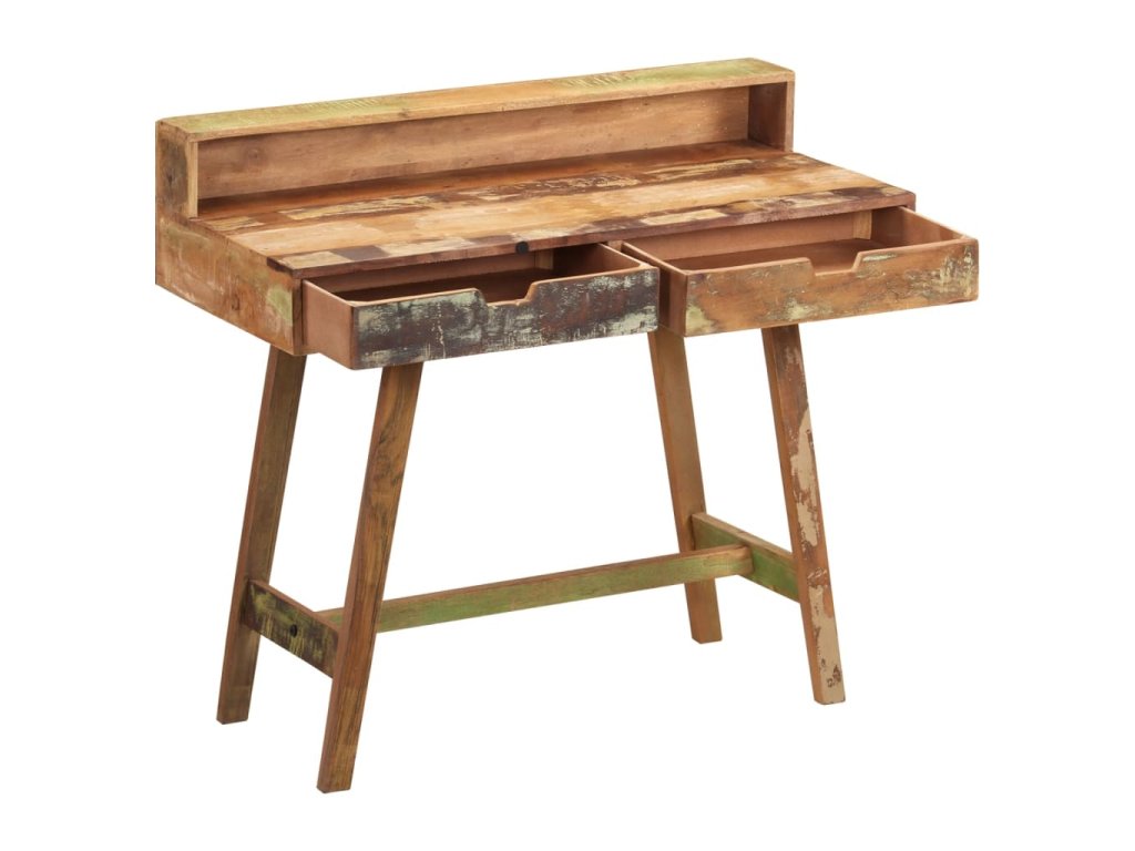 Tento dřevěný psací stůl ve vintage stylu, vyrobený z masivního recyklovaného dřeva, bude ve vaší domácnosti nadčasovým kusem nábytku. Stolní deska poskytuje stabilní a bezpečnou plochu k odkládání nápojů, košíků s ovocem, váz či dalších dekorativních předmětů. Jeho dvě zásuvky vám poskytnou spoustu místa na ukládání drobností, jako jsou klíče, poznámkové bloky a další maličkosti. Stůl se dá používat jako PC stůl, pracovní stůl, kancelářský stůl, stůl na čtení a studium apod.