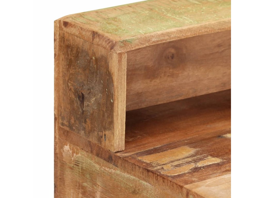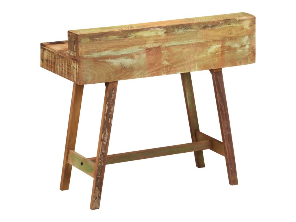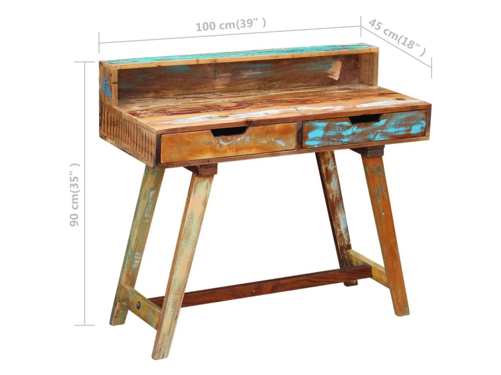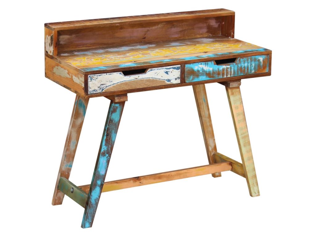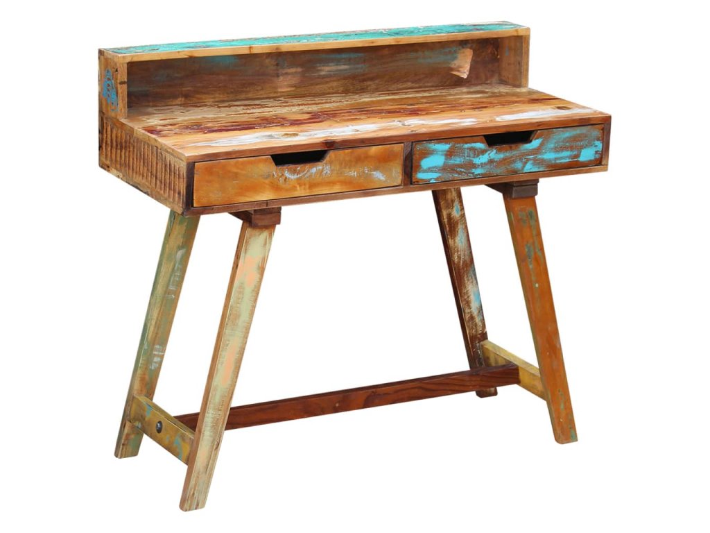 Tento dřevěný psací stůl ve vintage stylu, vyrobený z masivního recyklovaného dřeva, bude ve vaší domácnosti nadčasovým kusem nábytku. Stolní deska poskytuje stabilní a bezpečnou plochu k odkládání nápojů, košíků s ovocem, váz či dalších dekorativních předmětů. Jeho dvě zásuvky vám poskytnou spoustu místa na ukládání drobností, jako jsou klíče, poznámkové bloky a další maličkosti. Stůl se dá používat jako PC stůl, pracovní stůl, kancelářský stůl, stůl na čtení a studium apod.