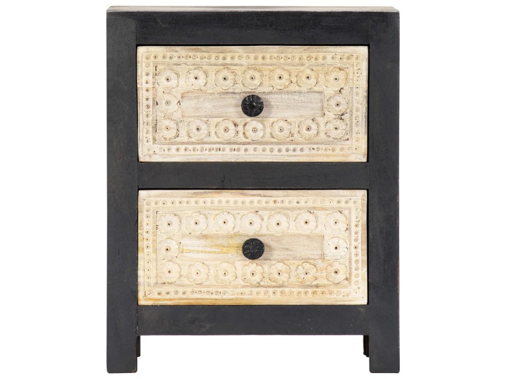 Noční stolek je vyrobený z masivního mangovníkového dřeva a byl naleštěn, natřen a nalakován, čemuž vděčí za svůj půvabný a rafinovaný vzhled. Dvě zásuvky s ručně vyřezávaným motivem dodávají noční skříňce na kráse a zároveň poskytují dostatek úložného prostoru pro přehledné uschování vašich drobností, které tak budete mít neustále po ruce. Sestavení skříňky je jednoduché a k jejímu čištění vám postačí vlhký hadřík.