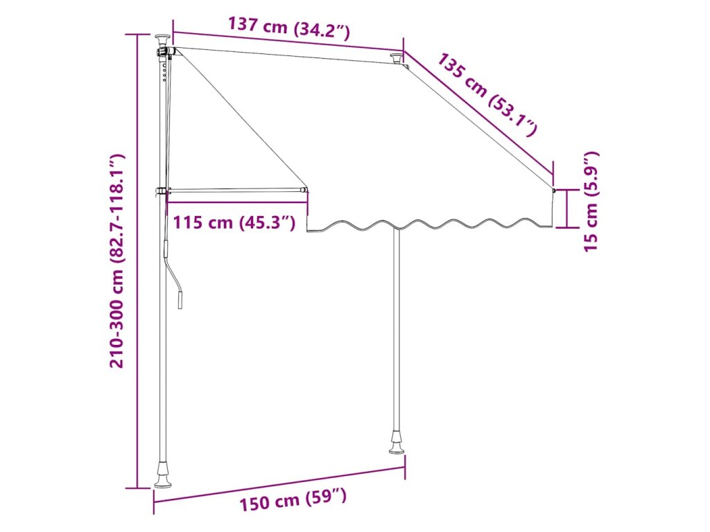 Markýza je vyrobená z kvalitního polyesteru potaženého vrstvou PU, a proto odpuzuje vodu i špínu a výborně vzdoruje klimatickým vlivům a UV záření. Silný ocelový rám jí dodává na pevnosti a prodlužuje její životnost. Polyesterová stříška se snadno čistí, lze ji totiž sejmout a oprat. Markýzu je možné zatahovat a roztahovat pomocí ruční kliky. Nastavit můžete i její výšku a sklon. Solárně napájená LED světla vám navíc v noci poskytnou osvětlení. Sestavení markýzy je jednoduché.