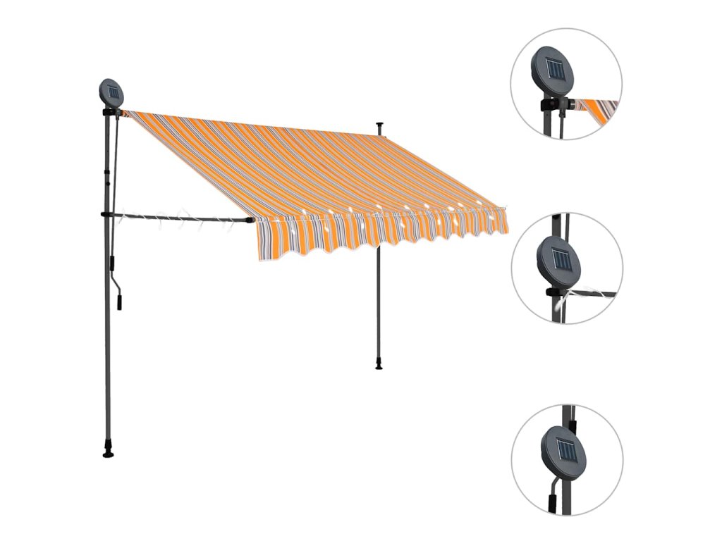 Markýza je vyrobená z kvalitního polyesteru potaženého vrstvou PU, a proto odpuzuje vodu i špínu a výborně vzdoruje klimatickým vlivům a UV záření. Silný ocelový rám jí dodává na pevnosti a prodlužuje její životnost. Polyesterová stříška se snadno čistí, lze ji totiž sejmout a oprat. Markýzu je možné zatahovat a roztahovat pomocí ruční kliky. Nastavit můžete i její výšku a sklon. Solárně napájená LED světla vám navíc v noci poskytnou osvětlení. Sestavení markýzy je jednoduché.