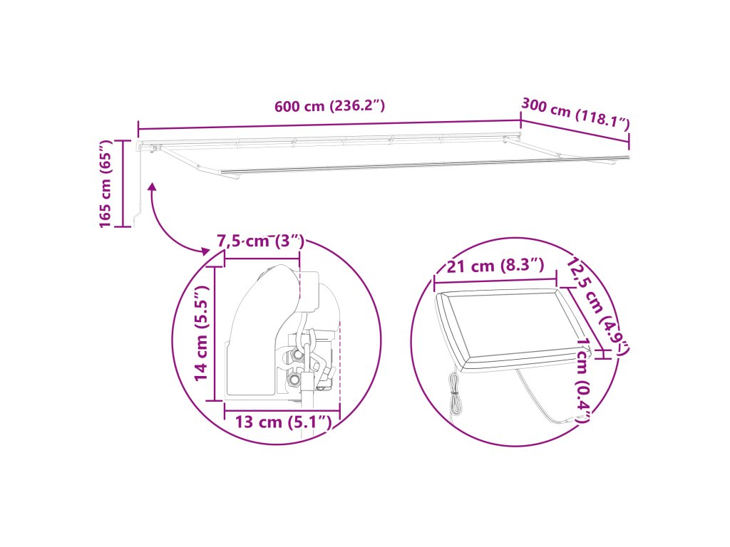 Před montáží a použitím výrobku je třeba si přečíst návod k obsluze. Tento návod si uschovejte pro budoucí použití. Tento výrobek je určen pouze pro venkovní a domácí použití jako ochrana před sluncem nebo dekorace. Nikdy jej nepoužívejte k jiným účelům ani výrobek neupravujte. Nepoužívejte jej na místech, kde dochází k vibracím, impulzům neob vysokým teplotám, například na stěnách v blízkosti pecí. Při montáži a nastavování markýzy vždy používejte vhodné osobní ochranné pomůcky. Při práci ve velkých výškách hrozí nebezpečí pádu, používejte vhodnou ochranu proti pádu. Při montáži buďte opatrní, může hrozit nebezpečí rozdrcení nebo useknutí. NEODSTRAŇUJTE bezpečnostní fólie. Tyto fólie lze odstranit až po dokončení všech montážních kroků, po upevnění všech šroubů a po připevnění výrobku ke stěně. Při předčasném odstranění fólie může dojít k vážnému zranění. Tento výrobek a jeho upevňovací díly jsou vhodné pouze pro instalaci na hladkou cementovou zeď nebo stabilní neomítnuté zdivo. Pokud stěna/zdivo vykazuje trhliny, je třeba se poradit s odborníkem. Pokud má vaše budova vnější plášť (např. izolaci, dvojitou cihlovou stěnu nebo cihlový obklad), měl by instalaci provést odborník. Nikdy neinstalujte na vysokých a větrných místech, protože by sluneční clona mohla spadnout a zranit osoby. Markýzu neinstalujte, pokud zjistíte, že jsou některé díly poškozené nebo zcela chybí. Vnější žaluzie se musí stáhnout v případě, že je rychlost větru vyšší než 28 km/h. Před otevřením markýzy se ujistěte, že jsou všechny držáky bezpečně připevněny ke stěnovým hmoždinkám a všechny šrouby jsou řádně dotaženy. VŽDY markýzu zavírejte při silném nebo prudkém větru, dešti a v době, kdy ji nepoužíváte. V opačném případě může dojít ke zranění osob a/nebo poškození majetku. Také výsuvná ramena jsou pod vysokým napětím a mohou způsobit vážné poškození nebo zranění. Děti by měly být pod dohledem, aby se zajistilo, že si se zařízením nebudou hrát. Nepoužívejte jej, pokud je nutná oprava nebo seřízení. Nepoužívejte markýzu, pokud se v její blízkosti provádí údržba, například mytí oken. Provoz v mrazivých podmínkách může markýzu poškodit. Nepokládejte na rám těžké věci, protože by mohly spadnout a způsobit poškození. Příliš pevné a příliš volné upevňovací prvky by mohly způsobit poškození výrobku nebo být nebezpečné pro osoby. Upozornění: Tkanina by se během provozu neměla prověšovat, jinak se na ní bude hromadit voda. Tkaninu nerozbalujte a neperte. Pokud potřebujete látku vyměnit, obraťte se s žádostí o pomoc na odborníky. Při ovládání ručního spouštění se zataženou vnější roletou buďte opatrní, protože může dojít k jejímu rychlému pádu v důsledku slabých nebo poškozených pružin. Nebezpečí! Silná pružina. NEODSTRAŇUJTE toto lano, dokud nedokončíte všechny kroky montáže, všechny šrouby nejsou utažené a předmět není připevněn ke zdi! Varování! Při povolování ramen dbejte opatrnosti, neboť jsou pod mechanickým tlakem! Náhlé uvolnění skládacího ramene může způsobit zranění. Varování: Před použitím výrobku si pečlivě přečtěte návod k obsluze. Varování: Používání při teplotách pod bodem mrazu může produkt poškodit. Externí použití v budovách a jiných stavbách.