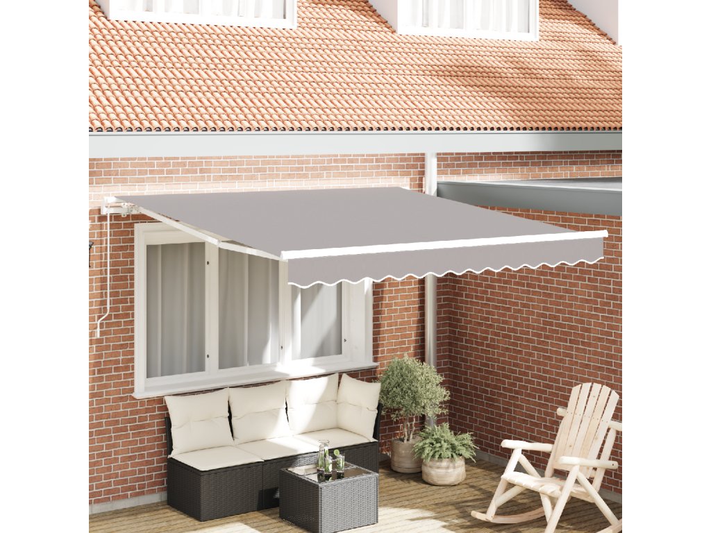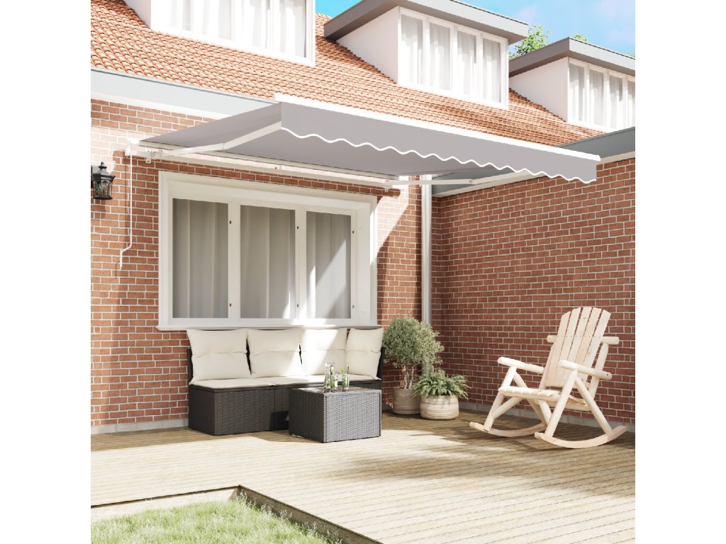 Tento šedý zasouvací slunečník přidává vašim venkovním prostorům kousek stylu a praktičnosti. S moderním vzhledem a velkým pokrytím z něj udělá skvělé místo na odpočinek nebo zábavu na balkonech a terasách. Jeho jednoduchý, ale chytrý design ladí s jakýmkoli venkovním prostředím a chrání vás před drsným počasím.