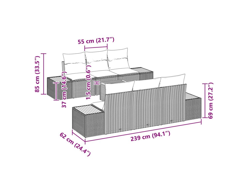 - 4 x boční sofa: 92 x 62 x 69 cm (DxŠxV)