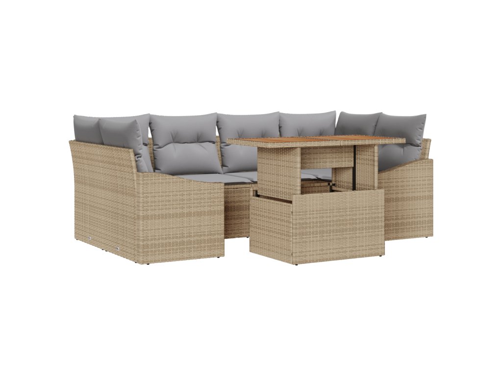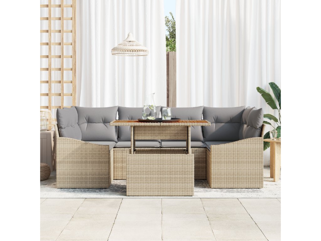 Materiály: Sestává z vysoce kvalitního polyratanu a masivního akáciového dřeva, tento jídelní set je navržen pro použití odolné vůči počasí. Materiál polyratan je mistrně tkaný, aby poskytoval stylový a moderní vzhled a zároveň podporoval odolnost proti ostrému slunečnímu záření. Doplněním designu, masivní akáciové dřevo přidává přirozený a organický pocit, harmonicky se slučující se svým okolím. Praktické komponenty: Tento set zahrnuje dvě pohovky s opěrkami, dvě rohová sedadla, dvě středová sedadla a jeden zahradní stůl, každý s integrovanými úložnými funkcemi. Navržené pro venkovní pohodlí, kusy nábytku poskytují prostorné oddíly pro udržení nezbytností organizovaných a skrytých, čímž udržují uklizený a funkční venkovní prostor. Strukturální prvky: Vybaven modulárním designem, tento set umožňuje snadnou rekonfiguraci uspořádání sezení. Nastavitelné nohy přidávají další funkčnost, zajišťují stabilitu na nerovných površích, zvyšují pohodlí a použitelnost. Každý kus má rámování s práškovým lakováním pro snadnou údržbu. Všestrané aplikace: Ideální pro zahrady a terasy, tento jídelní set může sloužit pro různé aktivity, od pořádání venkovních večeří po poskytování relaxačního prostoru pro rodinu a přátele. Jeho flexibilní design se bez námahy přizpůsobí různým uspořádáním zahrady a životnímu stylu. Péče o nábytek: Aby udržel svůj prvotřídní stav, používejte kryt na nábytek, když se nepoužívá. Další péče zahrnuje otírání povrchů suchým hadříkem a vyhnout se přímé vlhkosti. Přijetím těchto opatření zajistíte, že set zůstane funkční a vizuálně atraktivní po celé roky.- Barva: Beige a šedá