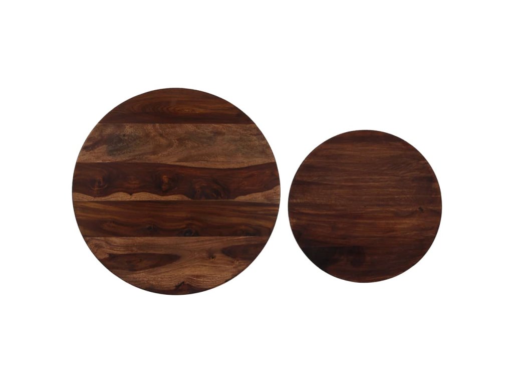 Stolní deska z masivního akáciového dřeva poskytuje stabilní povrch, na který si můžete položit nápoje, košík s ovocem nebo vázu a jiné dekorativní předměty. Akácie, kterému se někdy také říká palisandr nebo rosewood, je tropické tvrdé dřevo, jež je proslulé svou bohatou kresbou. Pevné ocelové nohy přispívají ke stabilní konstrukci a podtrhují industriální vzhled stolku. Díky zručnému řemeslnému zpracování a krásné struktuře dřeva je každý kus nábytku jedinečný a lehce odlišný od všech ostatních. Menší stolek je možné zasunout pod větší, abyste ušetřili místo.