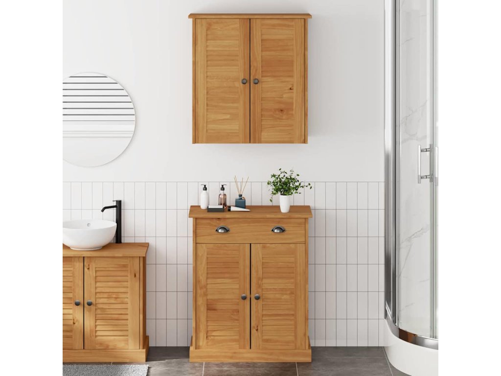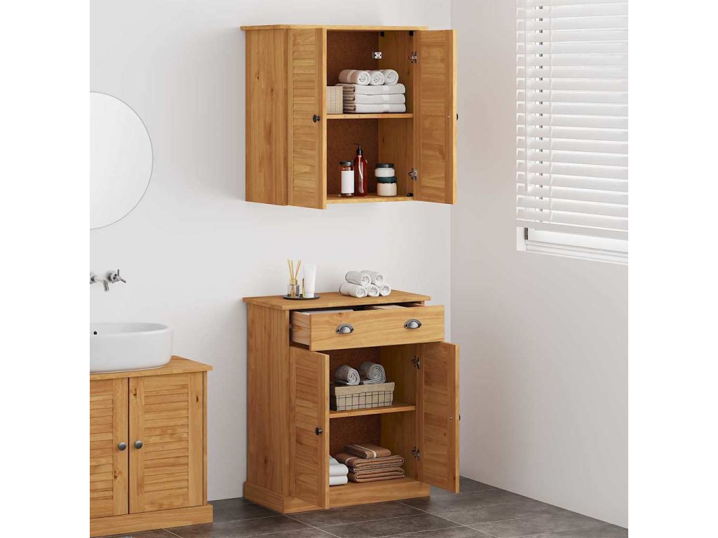 Tahle rustikální skříňka do koupelny je o vzhledu i praktičnosti, takže je ideální pro někoho, kdo chce přidat do svého domova rustikální nádech. Vyrobená z masivního borového dřeva, tahle praktická komoda nabízí spoustu úložného prostoru a zkrášlí vaši koupelnu. Její obdélníkový tvar a hladký povrch jí dodávají nadčasový vzhled, který se hodí ke každému rustikálnímu interiéru.