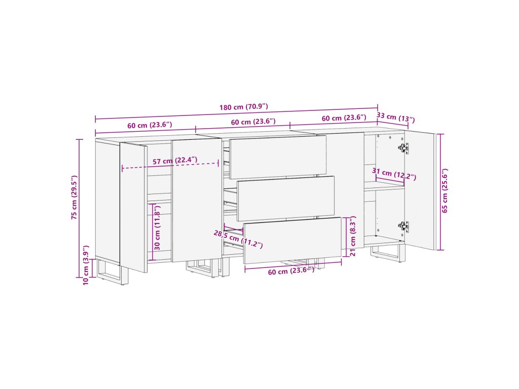 - 1 x Skříň s zásuvkami: 60 x 33 x 75 cm (D x Š x V)