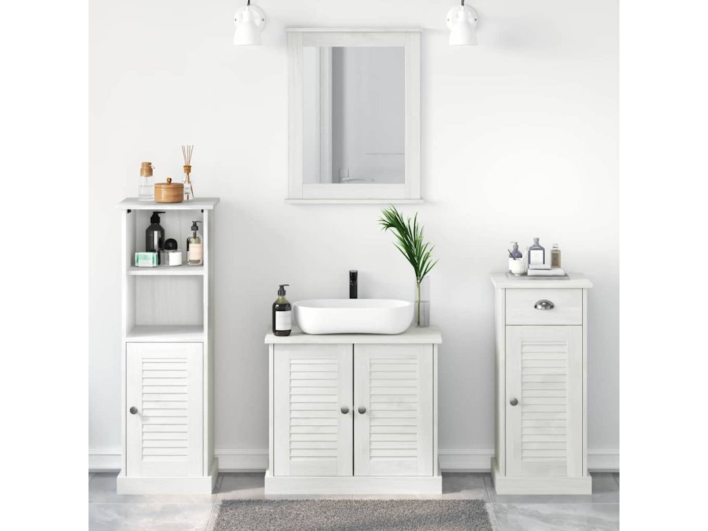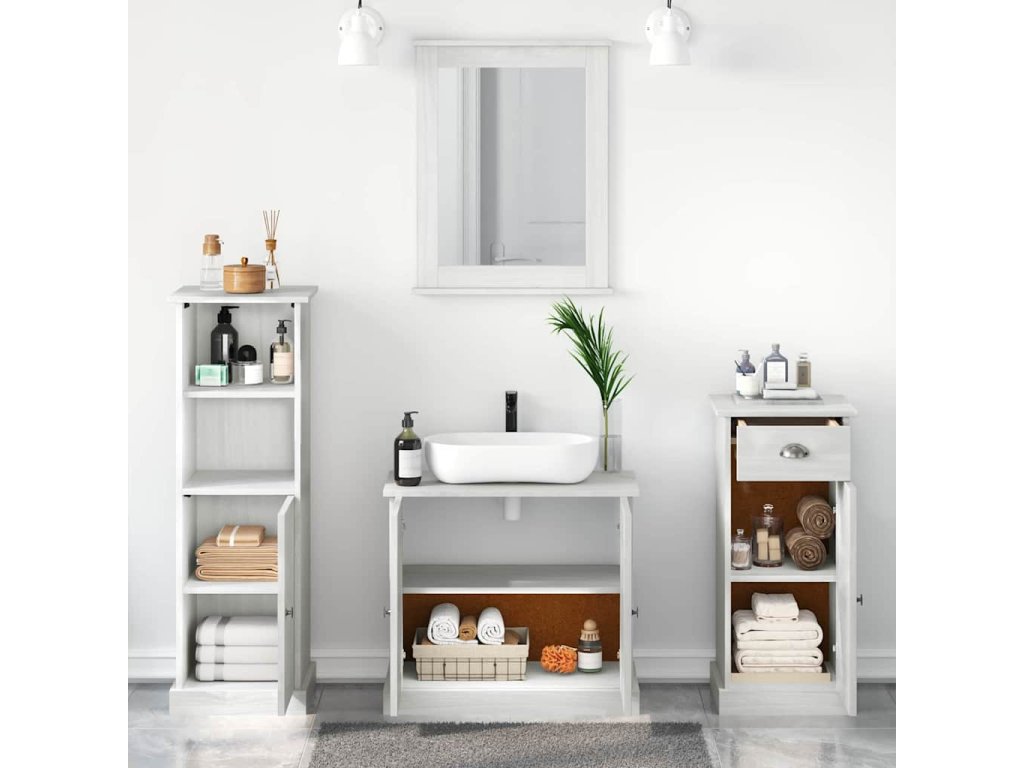 Tenhle rustikální koupelnový nábytek zosobňuje venkovský styl, kombinuje povedenou krásu a užitečnost. Navržen tak, aby zvýraznil teplo a přírodní charakter vaší koupelny, přináší útulnou a přirozenou atmosféru. Je vyroben převážně z masivního borového dřeva, má čistý obdélníkový tvar, což mu dodává jednoduchý rustikální šarm. Tohle je ideální volba pro ty, co hledají elegantní a vzdušný design. S klasickými policovými deskami a dveřmi na pantech, vypadá nábytek organizovaně a stylově, ideální pro úpravy v domácnosti. Ať už je v útulné koupelně nebo prostornější, toto uspořádání zaručuje, že praktičnost se potkává s pohodlím.