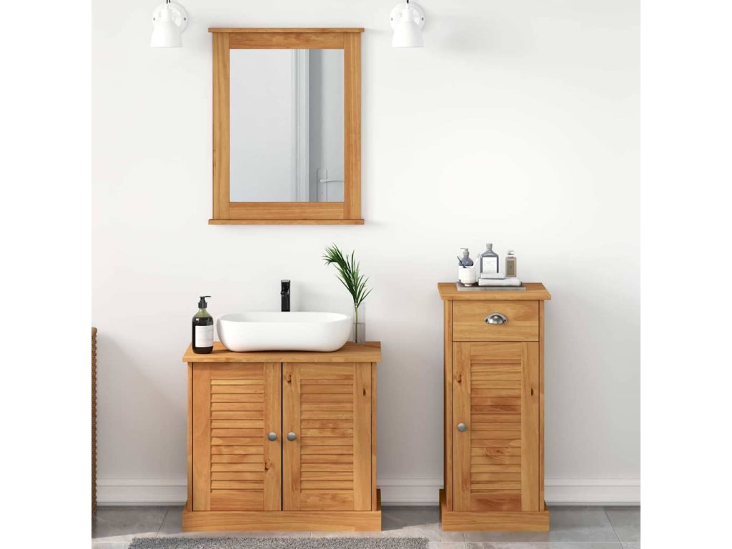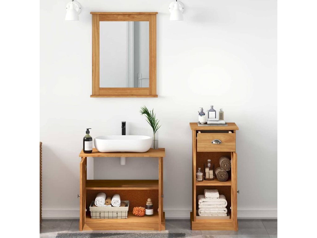 Tenhle rustikální koupelnový nábytek zosobňuje venkovský styl, kombinuje povedenou krásu a užitečnost. Navržen tak, aby zvýraznil teplo a přírodní charakter vaší koupelny, přináší útulnou a přirozenou atmosféru. Je vyroben převážně z masivního borového dřeva, má čistý obdélníkový tvar, což mu dodává jednoduchý rustikální šarm. Tohle je ideální volba pro ty, co hledají elegantní a vzdušný design. S klasickými policovými deskami a dveřmi na pantech, vypadá nábytek organizovaně a stylově, ideální pro úpravy v domácnosti. Ať už je v útulné koupelně nebo prostornější, toto uspořádání zaručuje, že praktičnost se potkává s pohodlím.