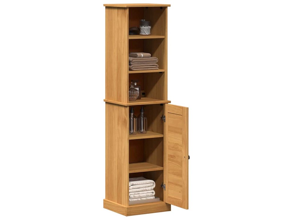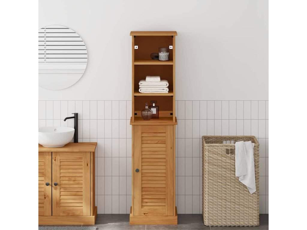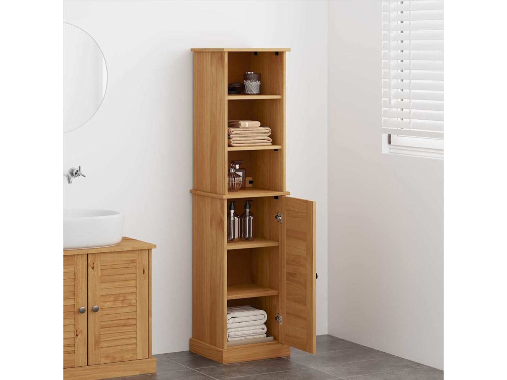 Sada rustikálního koupelnového nábytku zlepší vzhled a funkčnost vaší koupelny díky svému stylovému, přírodou inspirovanému designu. Je vyrobená z masivního borového dřeva a elegantních kovových prvků, které kombinují pěkný vzhled a praktické využití. Její rustikální kouzlo dodává unikátní nádech, ideální pro každého, kdo má rád přirozené a opotřebované věci. Tato sada je vhodná pro velké i malé koupelny a nabízí hodně úložného prostoru, zatímco všechno vypadá skvěle.