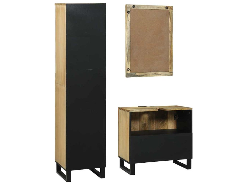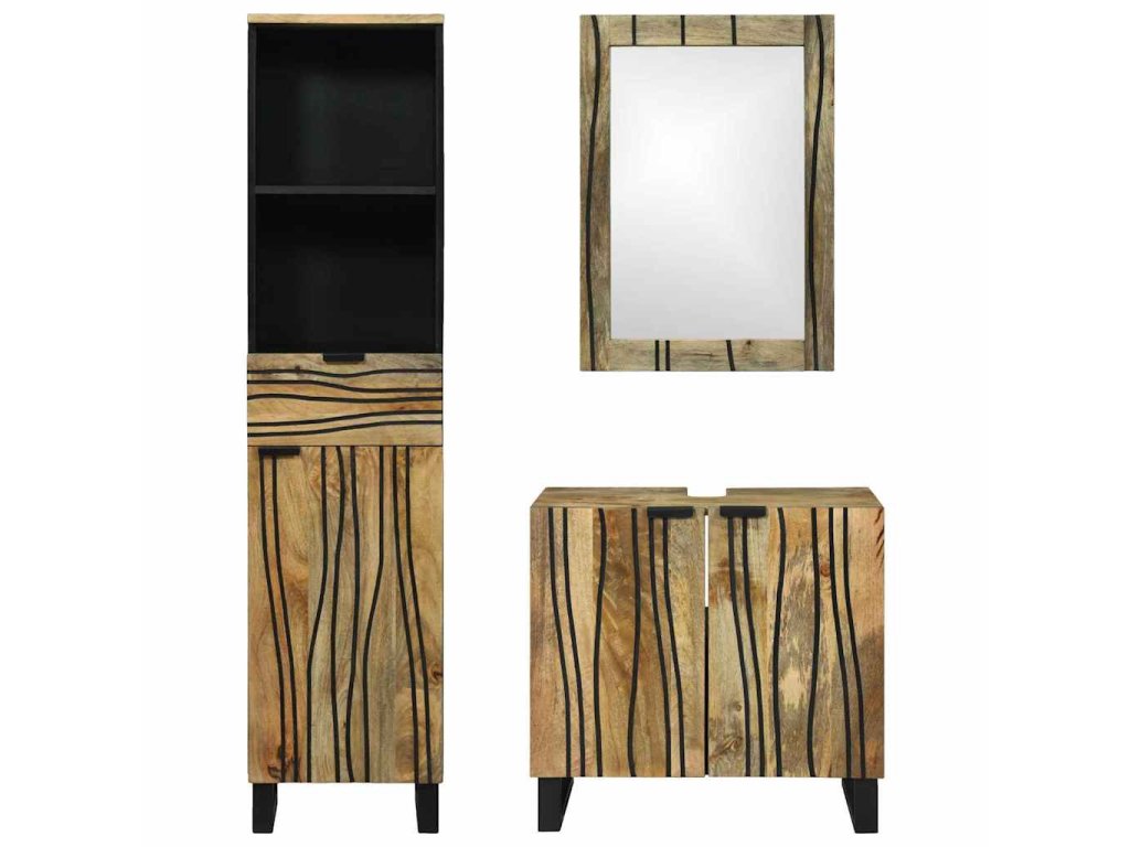 - Součásti zahrnuté: Set obsahuje zrcadlo s jasným odrazem, které vytváří prostorný pocit ve vaší koupelně. Také zahrnuje skříňku pod umyvadlo a vysokou skříň s dostatkem místa pro úložení.
