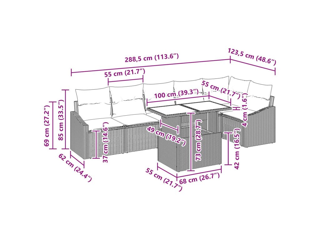 Materiály: Tento zahradní set vyrobený z polyratanu a práškově lakované oceli je super odolný a vydrží i špatné počasí. Tyhle materiály byly vybrány tak, aby vypadaly dobře a byly praktické, což zajišťuje, že váš nábytek bude atraktivní a spolehlivý po celou sezónu. Zahrnuté komponenty: Set obsahuje rohové sedadlo, tři střední sedadla, dva arm pohovky, stůl se skleněnou deskou a sadu šesti sedáků a sedmi polštářů. To umožňuje spoustu místa na sezení a pohodlné uspořádání pro vaši zahradu. Funkce/Design: Díky modulárnímu designu se dá set snadno přizpůsobit vašim potřebám a preferencím, a jeho lehká konstrukce ho dělá snadno přenosným. Materiály odolné vůči UV záření chrání set před blednutím a zajišťují, že barvy vydrží dlouho. Doporučené využití: Perfektní pro zahrady, terasy, balkony nebo verandy, pohovkový set se hodí do různých venkovních uspořádání. Jeho decentní design a pohodlné sezení jsou ideální pro setkání s kamarády nebo na poklidné chvíle na sluníčku. Údržba: Chcete-li zajistit dlouhou životnost a skvělý vzhled, používejte ochranný kryt, když set nepoužíváte. Pravidelně ho utírejte suchým hadříkem, abyste udrželi jeho komfort a šarm pro vaše setkání.- Barva: Šedá