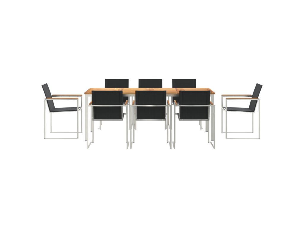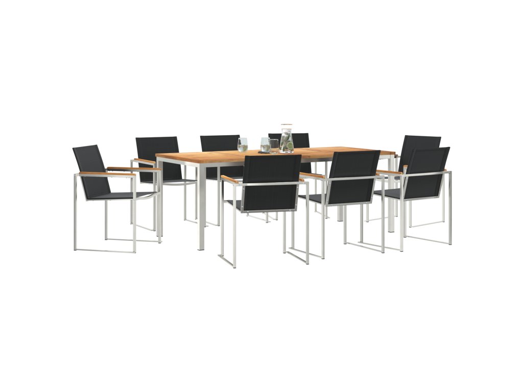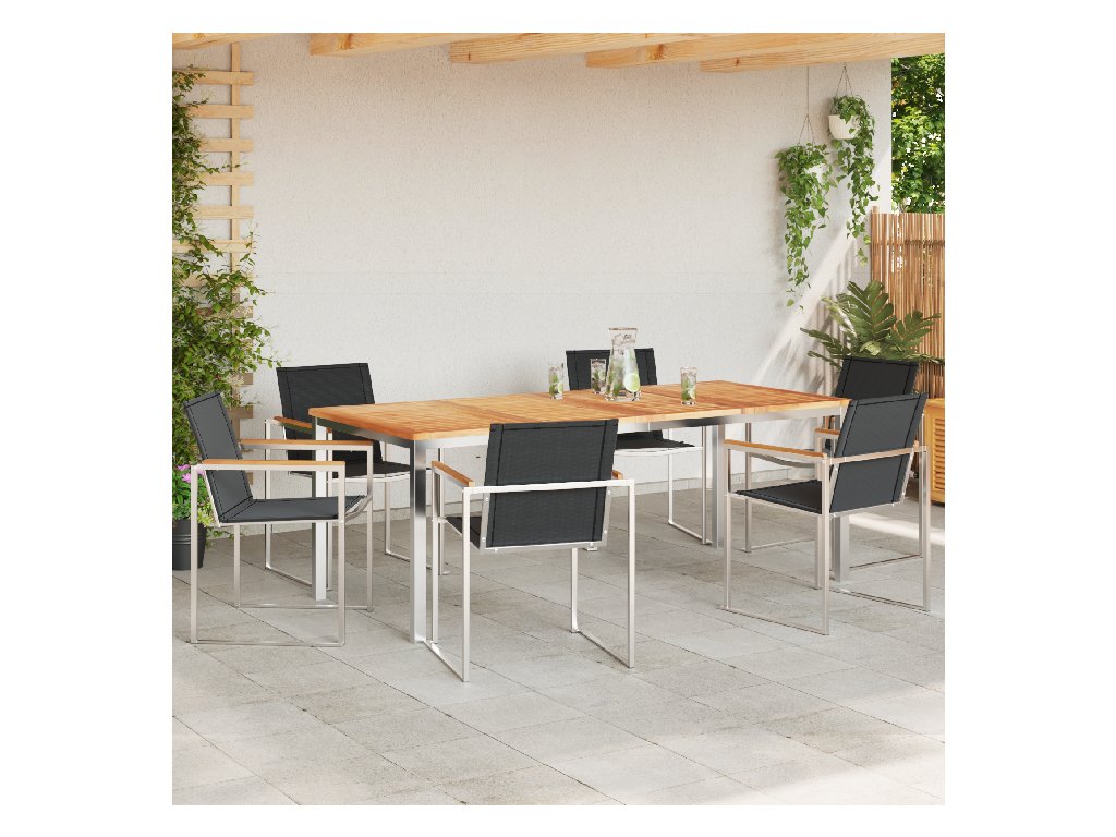 Materiály: Tento zahradní jídelní set spojuje silný ocelový rám s dřevěným stolem, což zajišťuje trvanlivost a přírodní hezký vzhled. Nerezová ocel mu dodává dlouhou životnost a odolává počasí, takže je fakt skvělou volbou pro vaši zahradu. Součásti: Najdete tu dřevěný stůl, který umožňuje odtok vody, takže se nebudou hromadit louže. Silné ocelové rámy zaručují stabilní posezení a skvělý jídelní zážitek, vše navržené pro trvanlivost a hezký vzhled. Vlastnosti / Funkce / Design: S pevnou konstrukcí je tenhle set bezpečný i v různém počasí. Elegantní stůl nejen skvěle vypadá, ale taky brání hromadění vody. Díky silnému ocelovému rámu jde o spojení funkčnosti a stylu pro perfektní venkovní jídelní prostor. Doporučené použití: Ideální pro zahrady a terasy, je tahle jídelní set přesně to pravé pro venkovní zábavu nebo klidné jídlo s rodinou. Jeho moderní vibe se skvěle hodí k současné estetice venkovních prostor. Vytvořte si útulné místo venku pro jídlo, čtení nebo prostě užívání si přírody. Údržba: Pro delší životnost používejte voděodolný obal, když není v provozu. Kovové části stačí otřít vlhkým hadříkem a dobře osušit. Tato pravidelná péče udrží váš zahradní nábytek hezký po celý rok.- Materiál: Masivní teakové dřevo