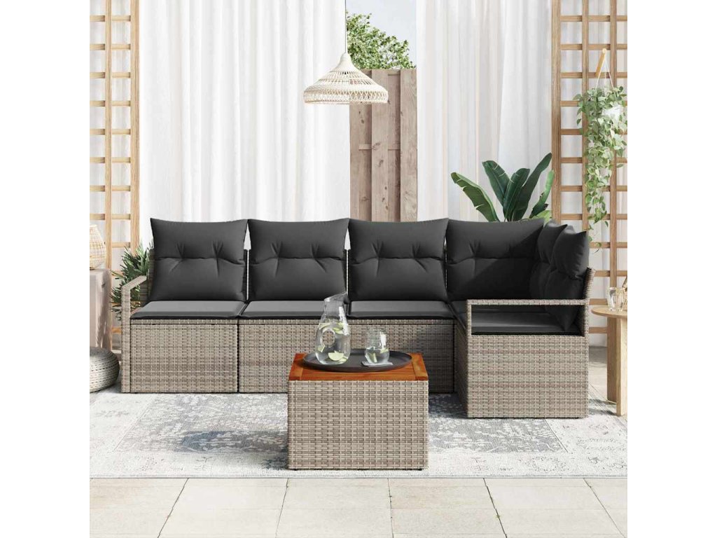 - Materiály: Vyrobeno z vysoce kvalitního polyratanu, tento set sedaček má odolný UV-odolný povrch ideální pro venkovní použití. Rámy z práškově lakované oceli zajišťují stabilitu a dlouhotrvající výkon po sezónách, zatímco solidní povrchy z akáciového dřeva dodávají celkovému designu dotek elegance a přirozeného šarmu.