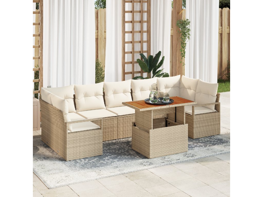 Materiály: Sada je vyrobena z prémiového poly ratanu, materiály nabízejí harmonické spojení estetiky a odolnosti. Rám z práškově lakované oceli zajišťuje spolehlivou konstrukci, zatímco prvky ze solidního akáciového dřeva dodávají nádech přírodní elegance. Odolnost proti UV záření zvyšuje dlouhověkost, což zajišťuje, že sada si udržuje svůj vzhled i přes sluneční expozici. Obsahuje: Tato kompletní zahradní sada obsahuje 2 armrestová sofa, 2 rohové sedačky a 3 středové sedačky, přičemž každá z nich má skryté úložné prostory pro větší užitek. Dále, elegantní zahradní stůl dokončuje sadu a nabízí perfektní místo pro občerstvení, nápoje a další. Vlastnosti / Funkce / Design: Navržena s modulárními možnostmi, sada umožňuje uživatelům ji přizpůsobit podle jejich potřeb. Nastavitelné nožičky poskytují flexibilitu na nerovných površích, zatímco ručně tkaný poly ratan dodává stylový a praktický design. Doporučené použití: Ideální pro venkovní setkání, tato sada se bezproblémově začleňuje do jakéhokoli zahradního nebo terasového prostředí. Vhodná pro lenošení, zábavu nebo vychutnání klidného odpoledne, její univerzálnost ji činí nadčasovým doplňkem jakéhokoli venkovního obytného prostoru. Údržba a péče: Aby sada zůstala v dokonalém stavu, používejte kryt, když není v použití, zejména během nepříznivého počasí. Pravidelná údržba zajišťuje dlouhodobé potěšení, čímž umožňuje, aby sada zůstala krásným prvkem ve vaší venkovní oblasti.- Barva: Béžová a krémová