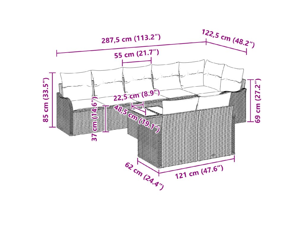 - 9 x Zádový polštář: 55 x 55 cm (D x Š)