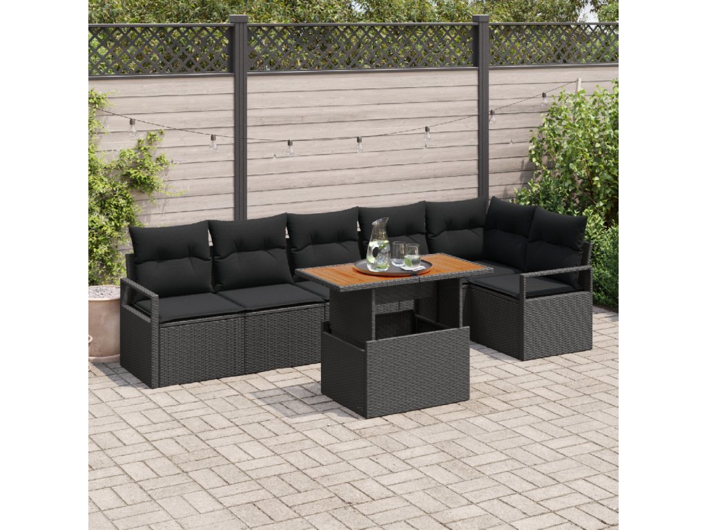 Všestranné materiály: Kombinací robustnosti poly ratanu, práškově lakované oceli a masivního akáciového dřeva, tato sada slibuje trvanlivost a styl. Poly ratan poskytuje moderní, povrch odolný vůči povětrnostním vlivům, zatímco práškový lak na rámu zajišťuje odolnost vůči každodennímu opotřebení, čímž zvyšuje vizuální přitažlivost a dlouhověkost. Úplná sada: Obsahuje dvě křesla s opěrkami, jedno rohové sezení, tři středové seaty a zahradní stůl, každý navržený s vlastními možnostmi úložiště. Tato sada maximalizuje prostor a funkčnost, poskytující dostatek prostoru k sezení pro všechny hosty a bezpečné úložiště pro polštáře a doplňky. Stylový design: Modulární konfigurace umožňuje nekonečné možnosti přizpůsobení, přizpůsobující se vašim konkrétním potřebám a preferencím. Nastavitelné nohy zajišťují stabilitu na nerovných površích, nabízející praktičnost bez obětování elegance. Pohodlí a ergonomie: Obsahuje ergonomické sezení s pěnovými polštáři pro nadstandardní pohodlí. Odnímatelné polyesterové potahy na polštáře se zipem poskytují snadnou údržbu a pohodlí, podporující delší životnost. Snadná údržba: Údržba je snadná s doporučením používat ochranný kryt, když se používá. Tento postup nejenže zachovává vzhled sady, ale také prodlužuje její použitelnost během více sezón.- Barva: Černá a hnědá
