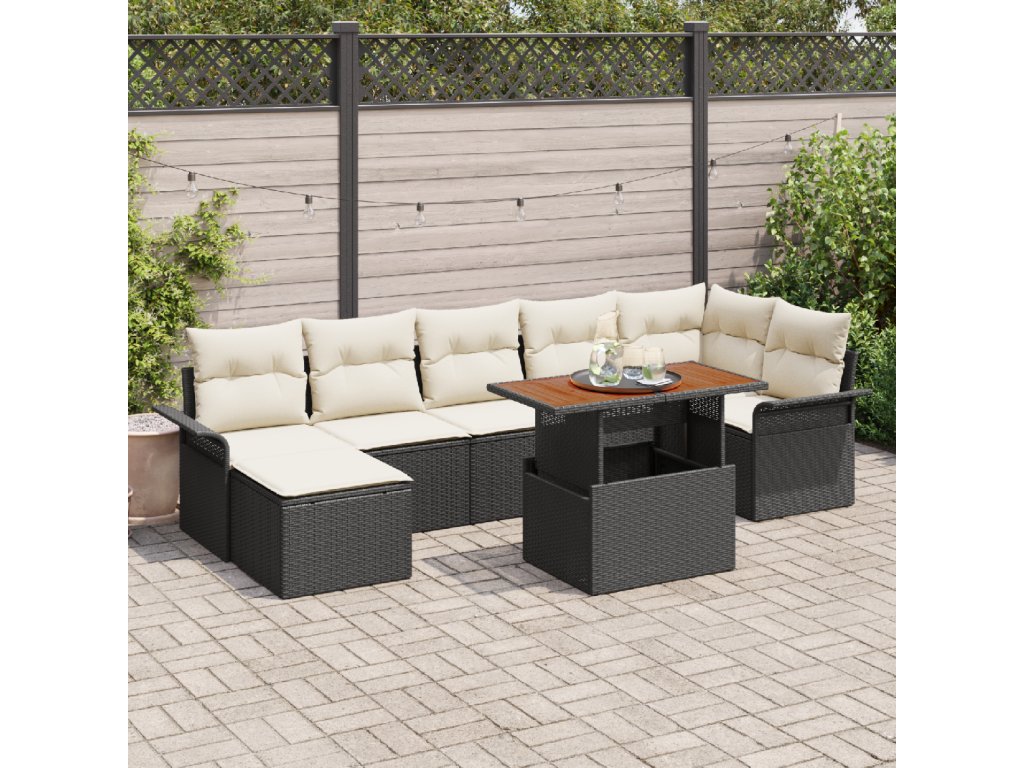 Prémiové materiály: Vyrobeno z polyratanu a masivního akáciového dřeva. Polyratan je odolný vůči UV záření a počasí, ideální pro venkovní používání. Akáciové dřevo přidává na odolnosti a teple designu. Kompletní sestava: Sada obsahuje dva arm pohovky, rohové sedadlo, tři středové sedáky, taburet a zahradní stůl – dost místa pro všechny. Každý kus má zaoblené hrany, takže se hodí do každé uspořádání. Materiály pro opření zajišťují pohodlí s rodinou nebo přáteli. Funkční stůl: Nastavitelný stůl se snadno mění z kávového na jídelní. Ideální pro ty, kdo ocení flexibilitu a využití prostoru. Vhodné použití: Perfektní na terasy, zahrady a dvorky, tato sada vytváří stylové prostředí pro venkovní stolování nebo relaxaci. Modulární design usnadňuje přemisťování a přizpůsobení na různé akce. Údržba: Chraňte nábytek krytem, když ho nepoužíváte. Pravidelně udržujte, aby zůstal v dobrém stavu a sloužil vám další sezóny.- Barva: Černá a krémová