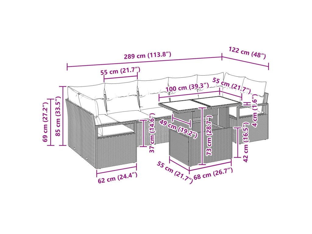 Materiály: Tento zahradní sofa set je vyroben z polyratanu, který je odolný a voděodolný, skvělý pro venkovní použití. Polyratan vypadá dobře a odolává UV záření a dešti. Polštáře z měkkého polyesteru přinášejí maximální pohodlí pro relaxaci po celý rok. Zahrnuté komponenty: Set obsahuje rohové a středové sedačky a odpovídající stůl. Můžete je poskládat různými způsoby podle potřeby. Integrovaný úložný prostor v opěrkách poskytuje dodatečný prostor, což dělá tento set praktickým a stylovým. Funkce / design: Modulární design umožňuje různorodé konfigurace, takže je skvělý nejen pro malé sešlosti, ale i pro větší akce. Materiály odpuzující UV záření zajišťují odolnost a dlouhou životnost i při různých povětrnostních podmínkách. Doporučené použití: Oživte terasy, zahrady, dvory či paluby tímto univerzálním modulárním setem, který se hodí jak pro neformální akce, tak pro sofistikovanější setkání. Je ideální pro relaxaci, čtení nebo užívání si přírody. Údržba a péče: Chcete-li ochránit před poškozením, zakryjte nábytek, když ho nepoužíváte, a během špatného počasí dejte polštáře dovnitř. Tyto jednoduché kroky zajistí, že set zůstane krásný jako v den, kdy dorazil.- Barva: Šedá