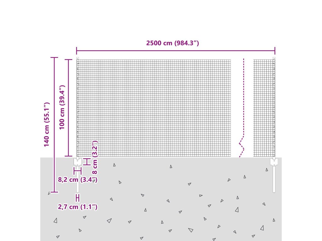 - Celkové rozměry: 2500 x 2,7 x 100 cm (D x Š x V)