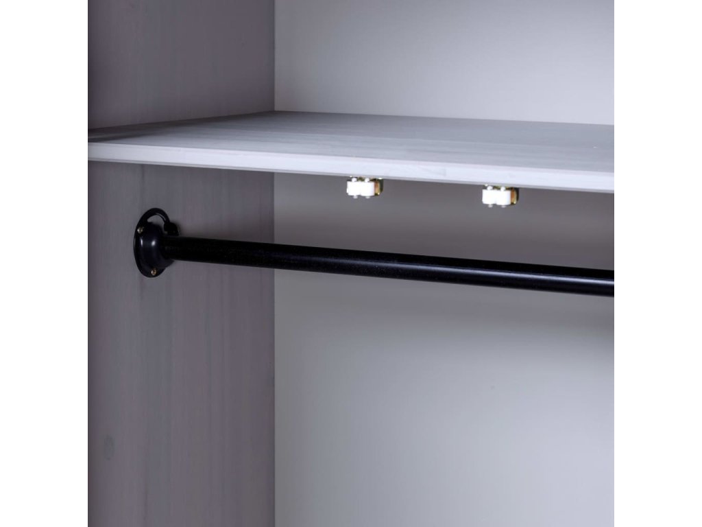 Textilní skříň má pevnou polici pro uložení a uspořádání bot, svetrů, džínů, klobouků, kabelek atd. Velká přihrádka je vybavená tyčí na ramínka, takže ji můžete použít k zavěšení kabátů, šatů apod. Šatní skříň je vyrobená z masivního borového dřeva, je tedy robustní a zaručuje dlouhodobé používání.