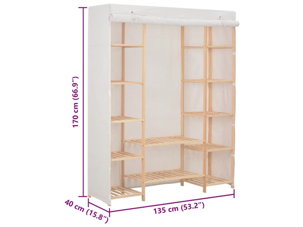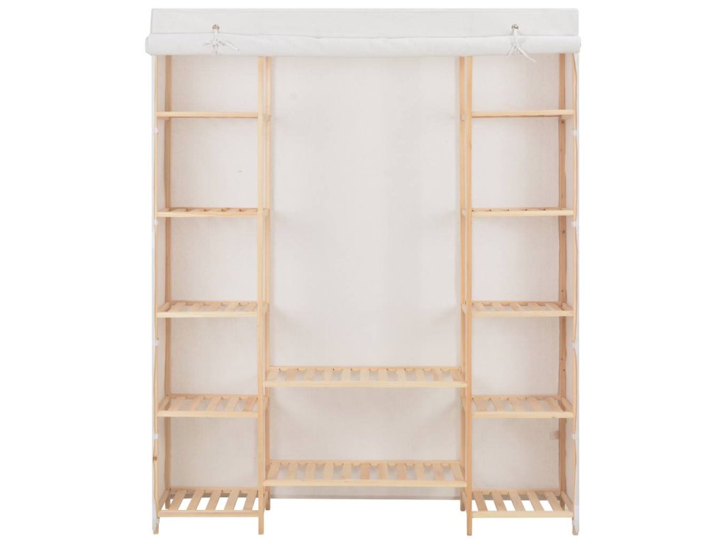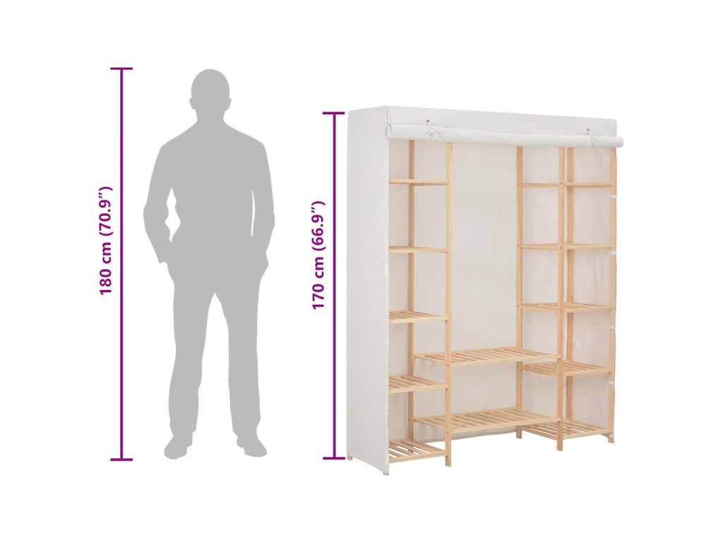 Organizér na oblečení má odolný dřevěný rám a celou řadu otevřených přihrádek. Látkový kryt skryje vaše oblečení před pohledy zvenku a zároveň je ochrání před prachem. Sestavení naší textilní šatní skříně je snadné.