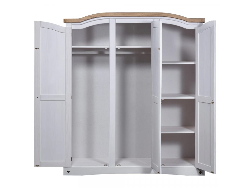 Šatní skříň má krásný klenutý design horní části a 3křídlé dveře. Pevná a bytelná skříň je zhotovená z masivního borového dřeva. V prostorné levé části je horní police a tyč na ramínka pro snadnou organizaci vašeho oblečení. V pravé části skříně jsou čtyři police, které jsou ideální pro vaše spodní prádlo, ponožky apod.