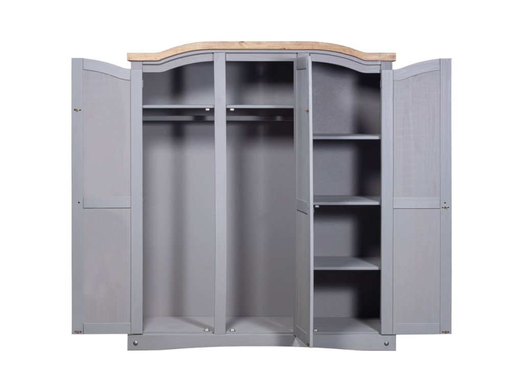 Šatní skříň má krásný klenutý design horní části a 3křídlé dveře. Pevná a bytelná skříň je zhotovená z masivního borového dřeva. V prostorné levé části je horní police a tyč na ramínka pro snadnou organizaci vašeho oblečení. V pravé části skříně jsou čtyři police, které jsou ideální pro vaše spodní prádlo, ponožky apod.