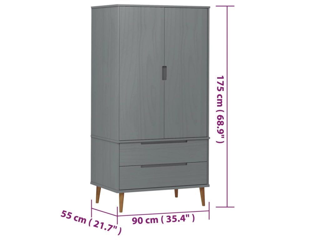 Šatní skříň MOLDE šedá 90 x 55 x 175 cm masivní borové dřevo