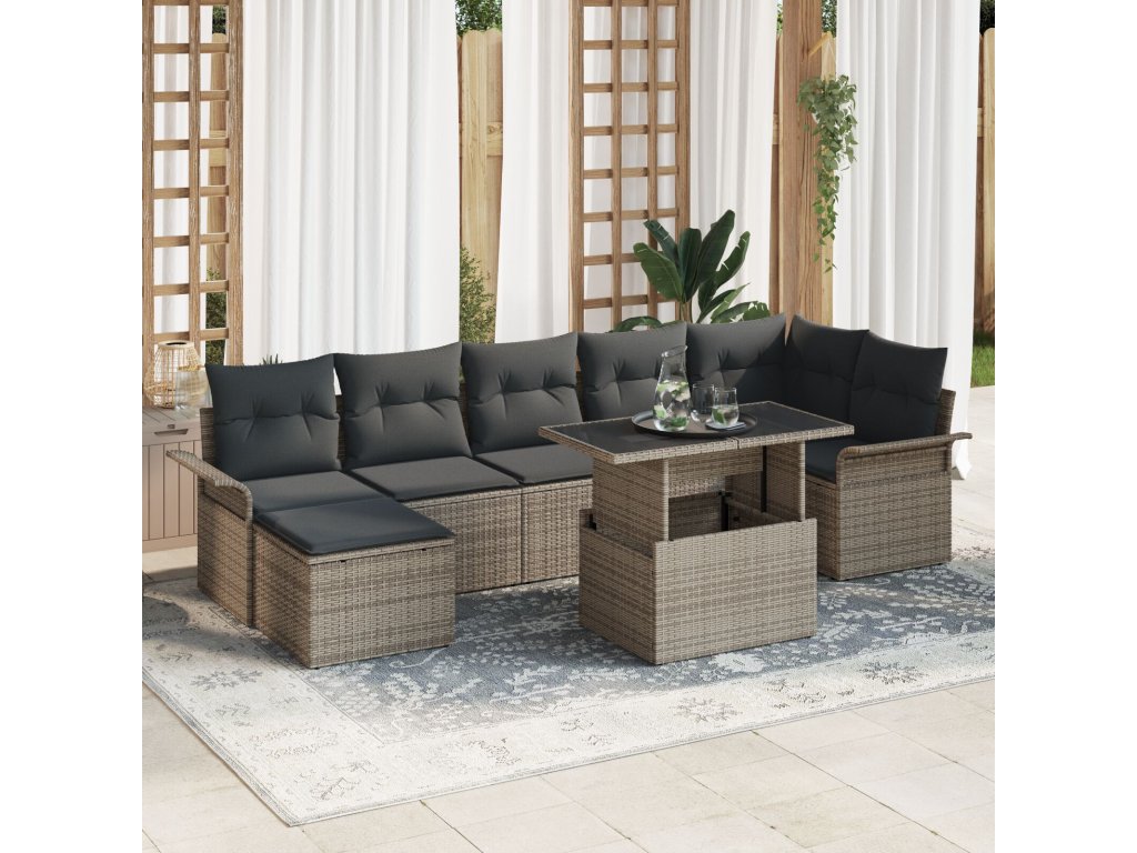 Odolná konstrukce: Tato souprava je z poly ratanu a tvrzeného skla. Poly ratan je skvělý na odolnost vůči opotřebení, zatímco sklo dodává eleganci a je snadné na údržbu. Zajišťuje, že souprava vypadá pořád skvěle, i když počasí dělá potíže. Funkční prvky: Má rohové sedadlo, centrální sedadla, pohovky s opěrkami, taburet a stůl, takže je ideální pro flexibilní sezení venku. Můžete snadno přesunout nebo přizpůsobit každý kus a všechno se skládá na vaše venkovní akce nebo relaxační odpoledne. Přizpůsobitelné vlastnosti: Stůl má mechanismus pro snadné nastavení výšky, takže ho můžete rychle změnit z konferenčního stolku na jídelní stůl. To hodně zvyšuje funkčnost soupravy a je skvělý pro různé aktivity, od chvil strávených relaxací po formální večeře. Odolnost vůči povětrnostním podmínkám: Každý kus je odolný vůči UV záření a dešti, takže se mu nic nestane. Zajišťuje, že souprava nejen vypadá skvěle, ale je taky robustní a bezstarostná v každém počasí. Pokyny pro péči: Pro nejlepší údržbu zakryjte soupravu, když ji zrovna nepoužíváte, abyste ji ochránili před špatným počasím. Kryt prodlužuje její životnost, takže se stane dlouhodobou oblíbenou součástí vašeho venkovního prostoru.- Barva: Šedá