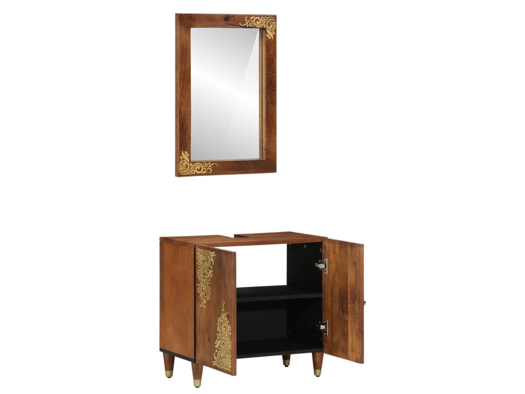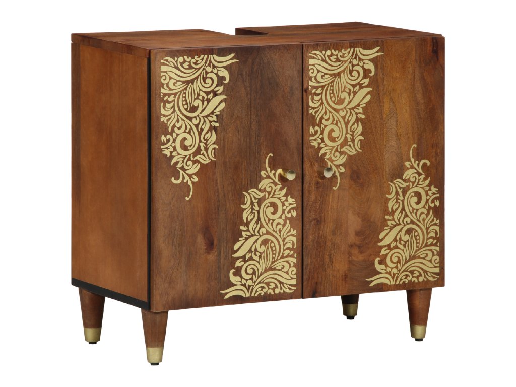 Tato rustikální koupelnová skříň spojuje styl s funkčností a přináší přírodní krásu přímo domů. Pečlivě vyrobená z masivního mangového dřeva je silná a vyznačuje se unikátní texturou. Elegantní zlatý sítotisk na dvířkách skříňky dodává umělecký šmrnc a stává se středobodem nejen ve rustikálních koupelnách. Je navržena tak, aby splnila vaše potřeby úložného prostoru a zároveň ladila s vaším dekorem.
