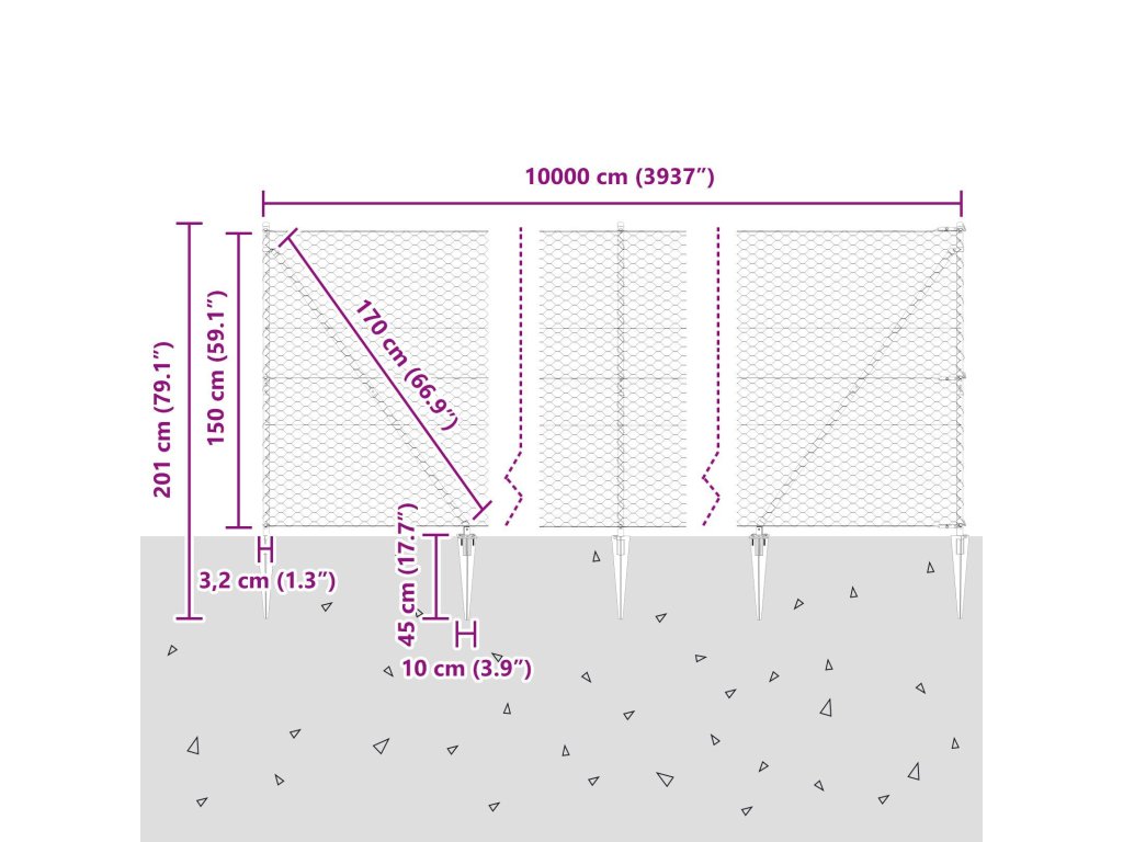 - Celkové rozměry: 10000 x 3,2 x 150 cm (D x Š x V)