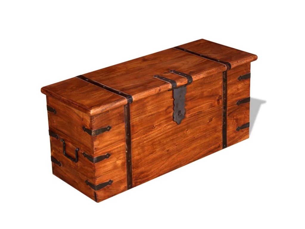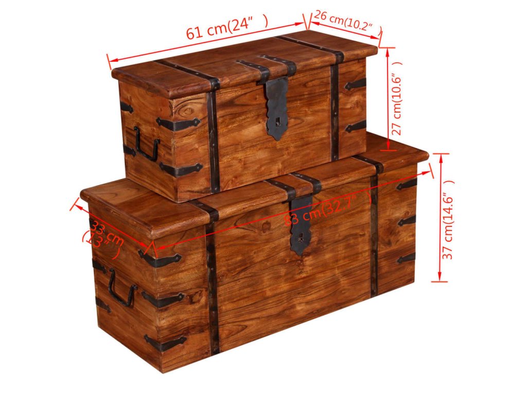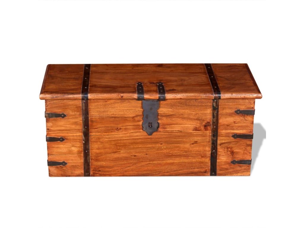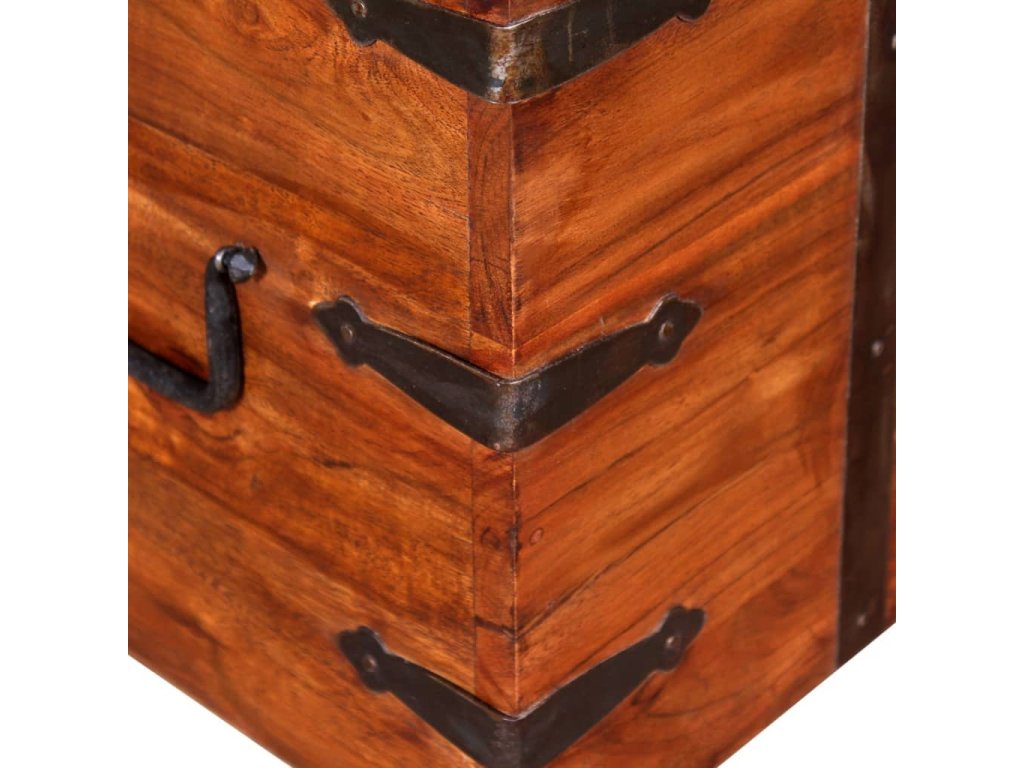 Tyto úložné boxy vnesou do vašeho bydlení dostatek úložného prostoru pro oblečení, časopisy, knihy, nářadí a další příslušenství. Na přední straně mají západku a dvě rukojeti po stranách. Jelikož mají pevnou horní desku, lze tyto dřevěné boxy použít také jako konferenční stolky, stolky ke gauči, stolky do obývacího pokoje, odkládací stolky, koncové stolky atd. Úložné truhly jsou ručně vyrobené z masivního akáciového dřeva a mají charakteristické vlastnosti palisandru a rosewood. Zručné řemeslné zpracování a krásná kresba dřeva propůjčuje každému kusu nábytku jeho jedinečný a od všech ostatních lehce odlišný vzhled.