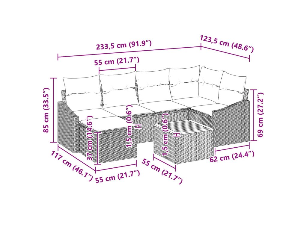 Tato zahradní pohovka s polštáři má moderní a funkční design, ideální pro jakoukoli zahradu nebo terasu. S čistými liniemi a minimálními ozdobami poskytuje souprava stylový vizuální dojem, zvyšující atmosféru venkovních prostor. Kombinace odolných materiálů zajišťuje, že souprava je nejen vizuálně atraktivní, ale také vytvořená, aby odolala různým povětrnostním podmínkám. Perfektní pro shromáždění, poskytuje dostatek místa k sezení a zároveň nabízí útulné útočiště pro relaxaci.