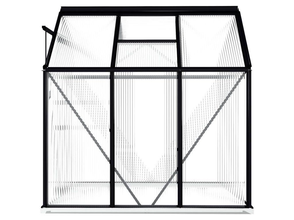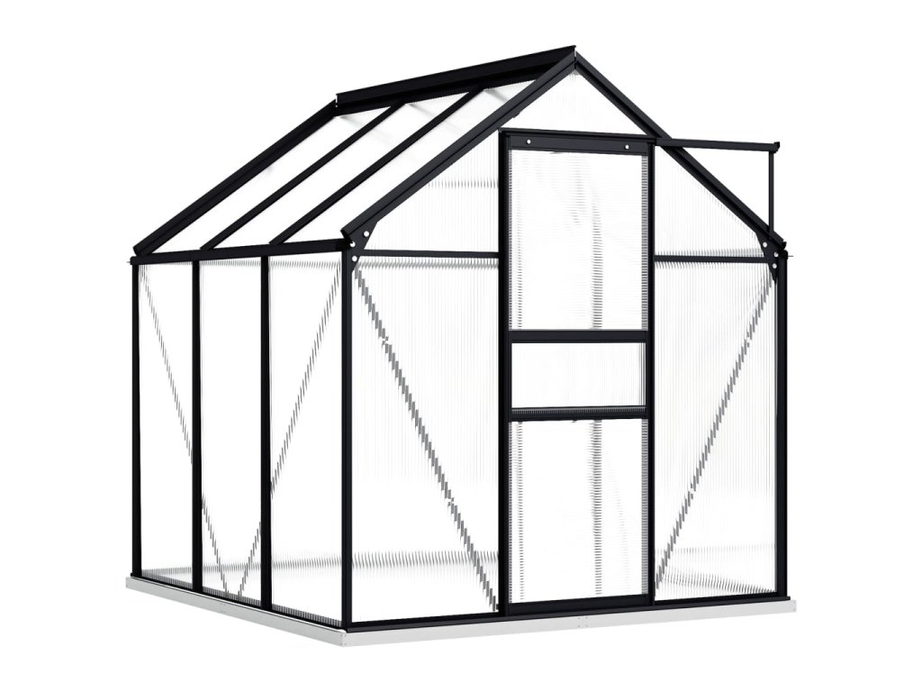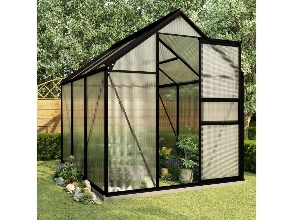 Tento masivní skleník je vyrobený z polykarbonátových desek, je odolný vůči UV záření a tepelně izolovaný. Má také robustní a bezúdržbovou hliníkovou konstrukci a podkladový rám (zhotovený ze 4 silných profilů) pro lepší stabilitu. Systém okapů umožňuje efektivní odvod vody a větračky ve střeše zaručují optimální ventilaci za velmi horkých dnů. Střešní panely jsou upevněné kovovými sponami, které zaručují odolnost a dlouhodobé používání. Sestavení našeho skleníku je snadné.
