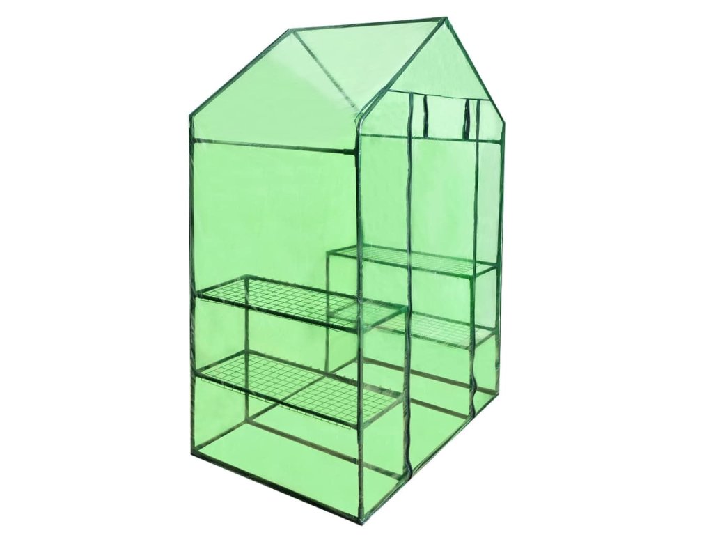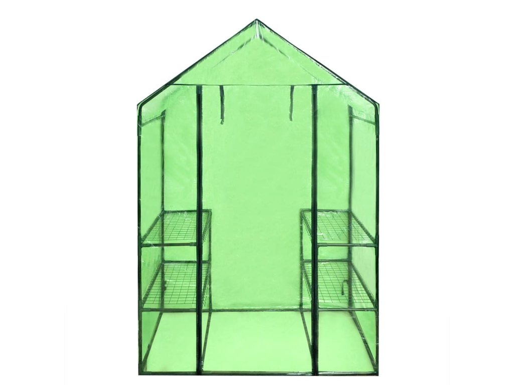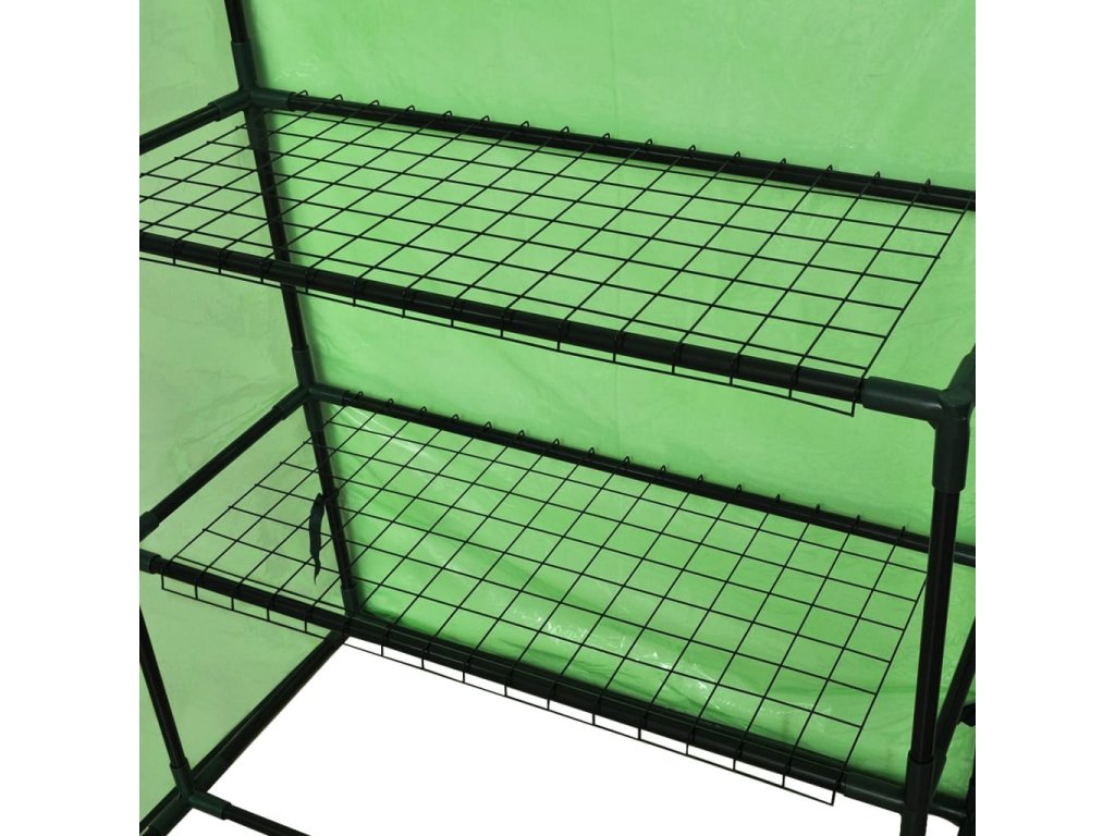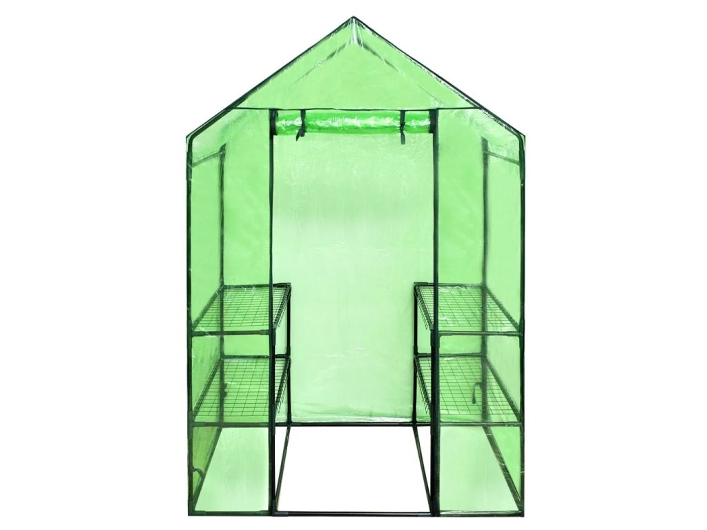 Tento skleník je vynikající na pěstování rostlin a jejich ochranu před špatným počasím . Dodáváme ho s pevnou práškovanou ocelovou konstrukcí a plachtou odolnou vůči potrhání . Povrch je odolný vůči UV záření a je z mrazuvzdorného materiálu . Nemusíte se proto obávat škod způsobených zimou nebo sluncem . Díky průsvitné plachtě se slunce dostane k rostlinám . Na každé straně jsou 2 přihrádky , takže je ve skleníku dostatek místa . Pod přihrádkami si můžete uložit květináče . Rolovací dveře na zip umožňují snadný vstup . Skleník je velmi lehký a dá se přenášet podle potřeby po zahradě .