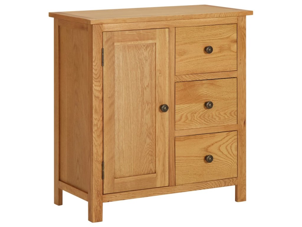Tato odkládací skříňka je zručně zhotovená z masivního dubového dřeva a MDF a je nejen funkční, ale má také dlouhou životnost. V jedné přihrádce s dvířky a třech zásuvkách najdete dostatek úložného prostoru pro vaše osobní věci, a tak vám naše odkládací skříňka usnadní udržování pořádku v pokoji. Můžete ji používat také jako příborník.