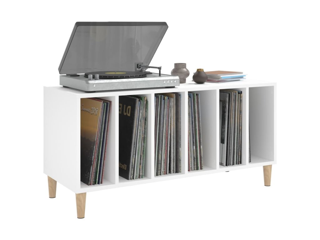 - Robustní horní část: Pevná horní část skříňky na vinyly je ideální pro umístění přehrávače nebo jiné elektroniky.